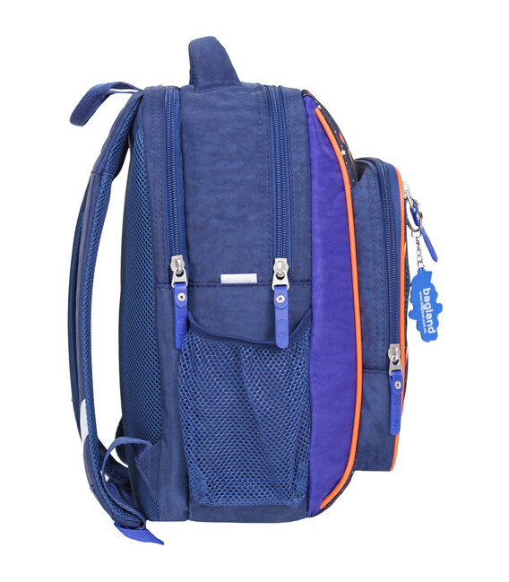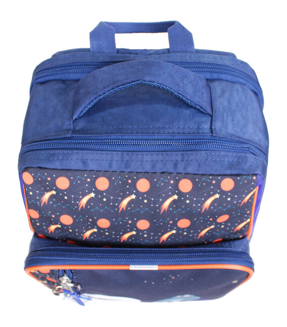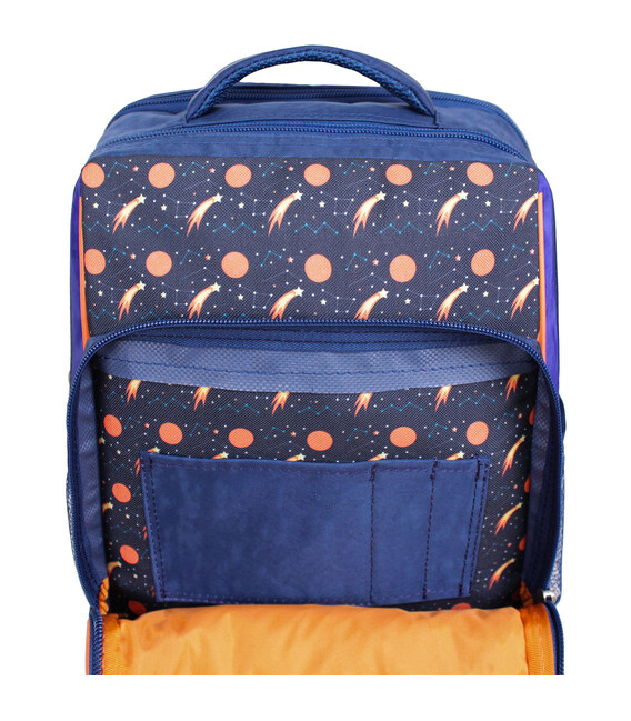 У рюкзаку — два просторі відділення на блискавці, де легко помістяться підручники, зошити або улюблені іграшки. Є також менше за розміром відділення з органайзером для канцтоварів — з ним можна обійтися без пенала. Спереду розташована зручна кишеня на блискавці для дрібниць — наприклад, телефону чи ключів. По боках — сітчасті кишені для пляшки з водою або термоса.