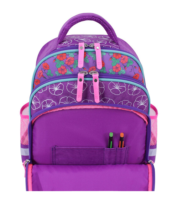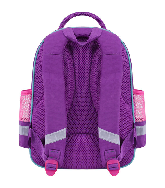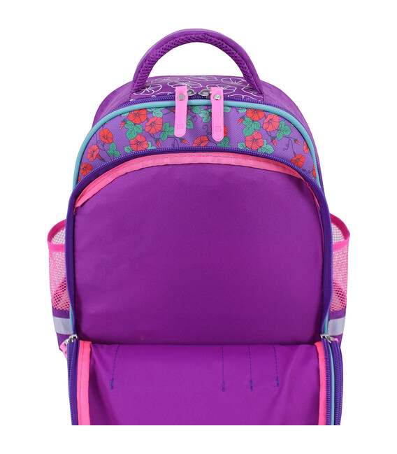 Основне й найбільше відділення підійде для підручників і спортивної форми. Друга кишеня призначена для зошитів, блокнотів чи альбому для малювання, а відсік-органайзер спереду — для дрібних канцтоварів і пеналу. Бічні сітчасті кишені вмістять пляшку з водою та парасольку.