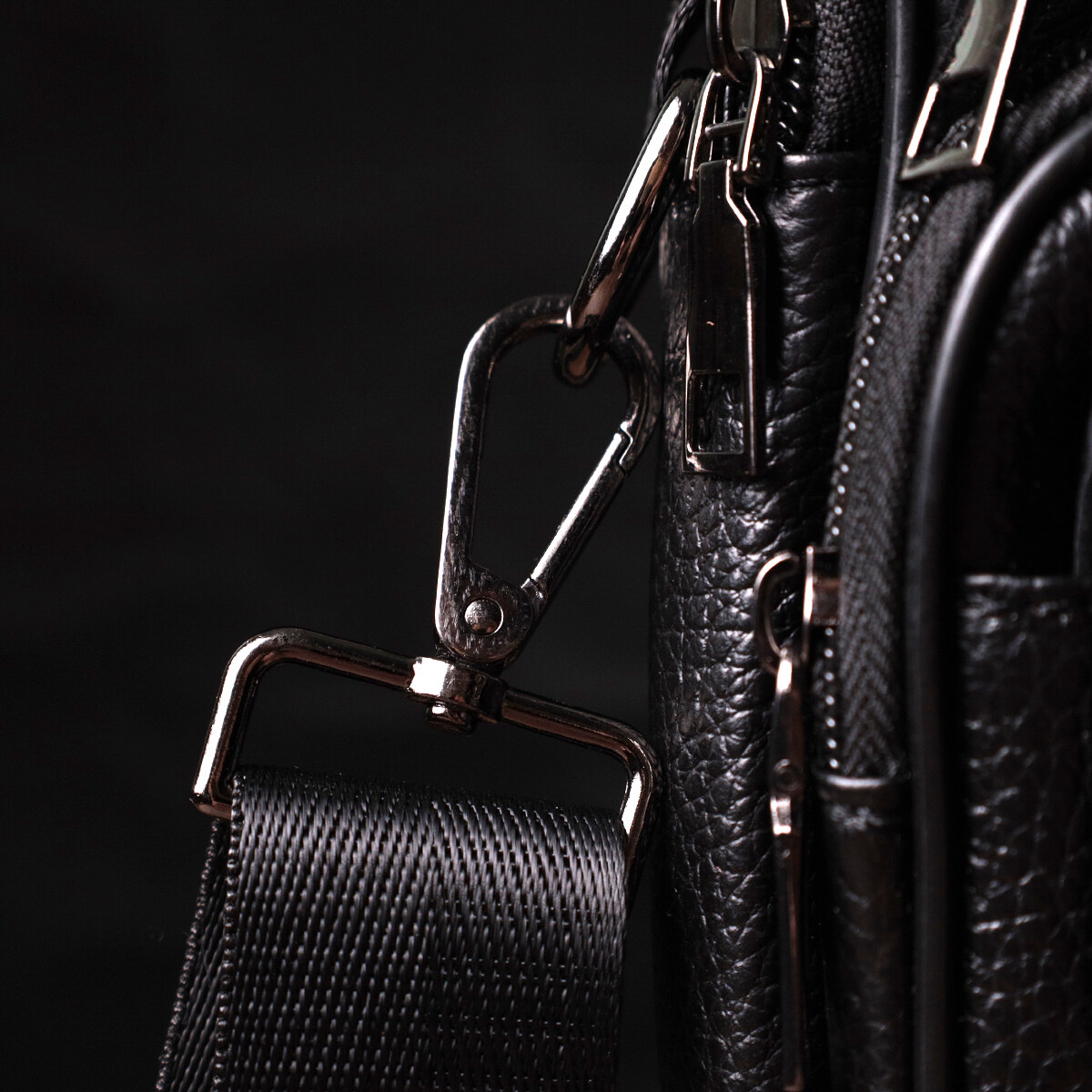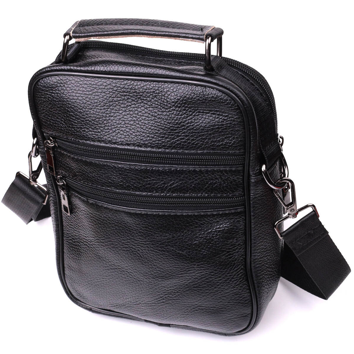 Стильный мужской мессенджер из натуральной кожи. Аксессуар можно носить в руке, на плече и через плечо, для этого предусмотрена кожаная ручка и съемный плечевой ремень. В изделии использована качественная фурнитура и надежная подкладка. По краям аксессуар прошит ровной строчкой. Сумка станет прекрасным подарком для любого мужчины.