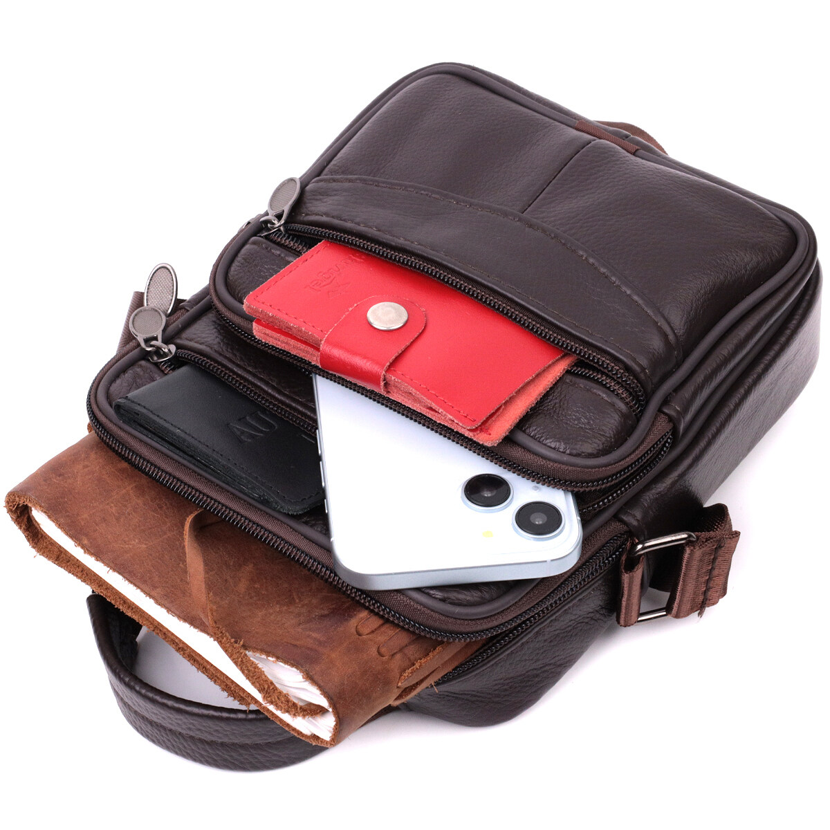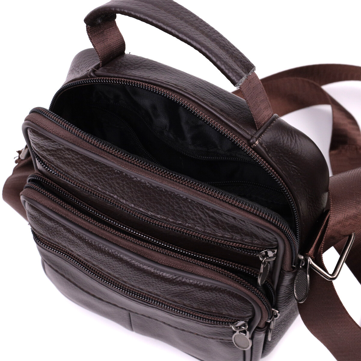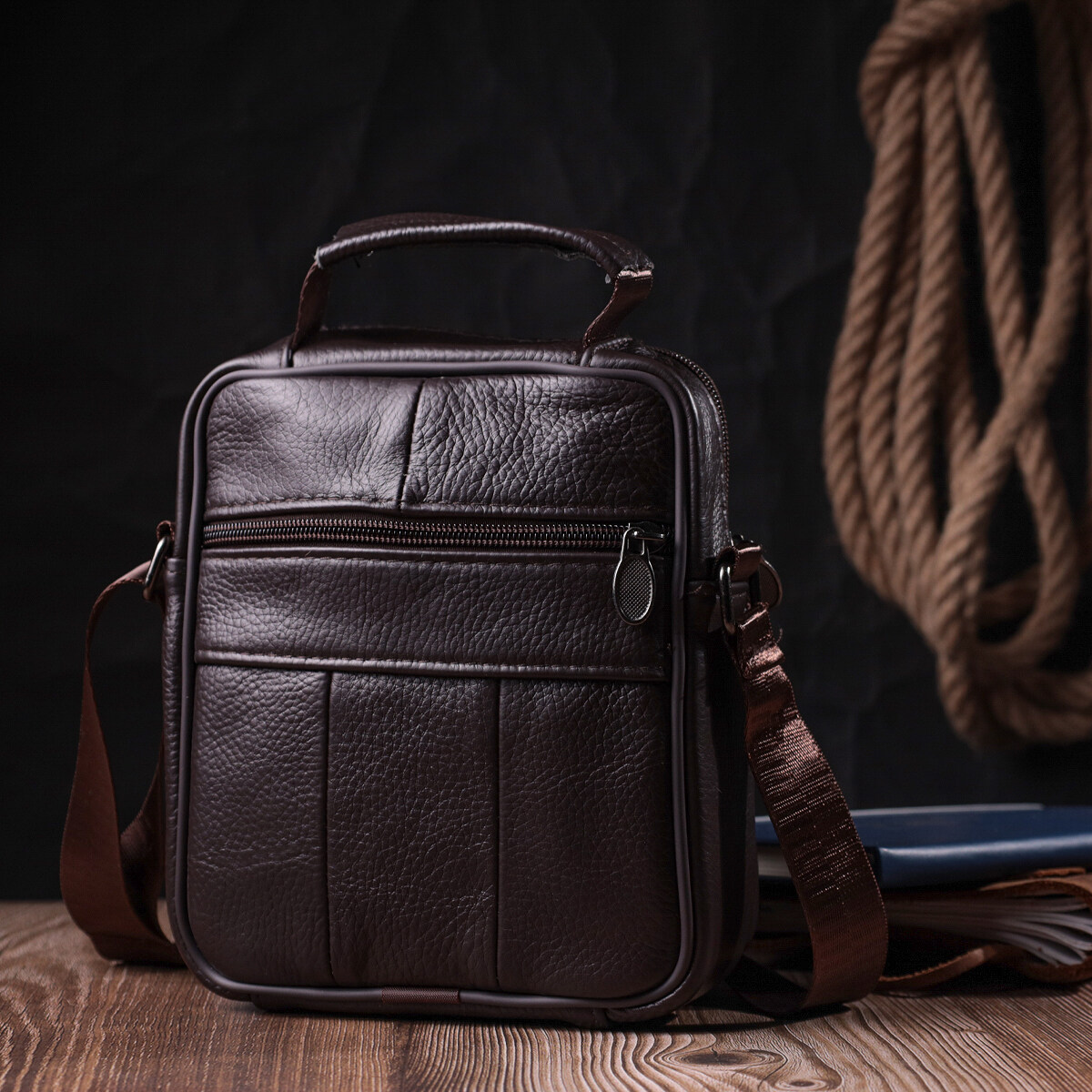 Компактная мужская сумка из натуральной кожи. Аксессуар совсем не прихотлив в уходе и пользуется особой популярностью у мужчин. В изделии использована качественная фурнитура и надежная подкладка. По краям аксессуар прошит ровной строчкой. Сумка станет прекрасным подарком для любого мужчины.