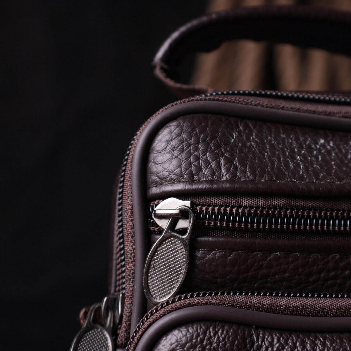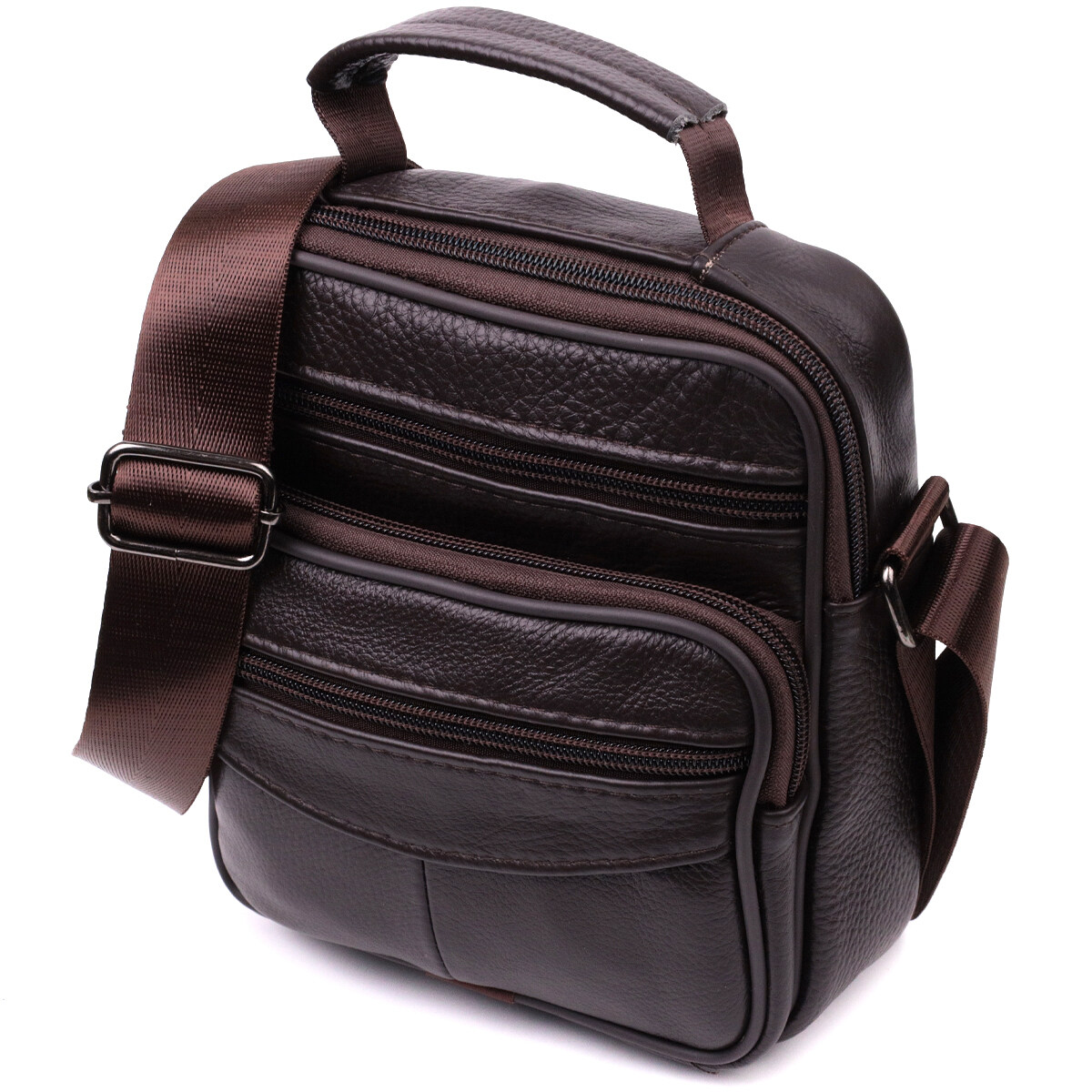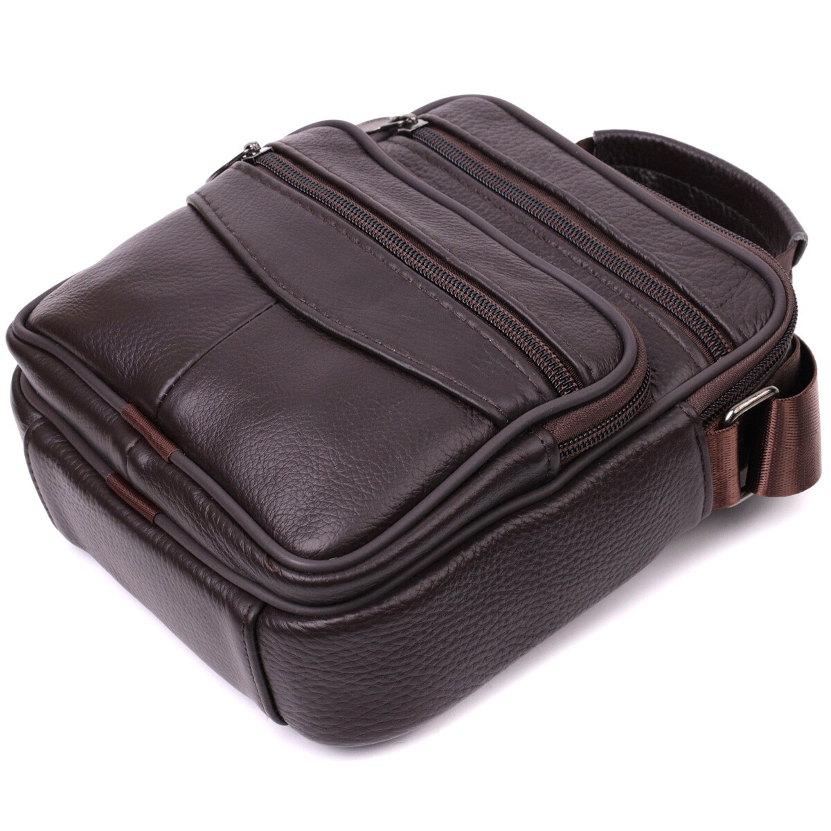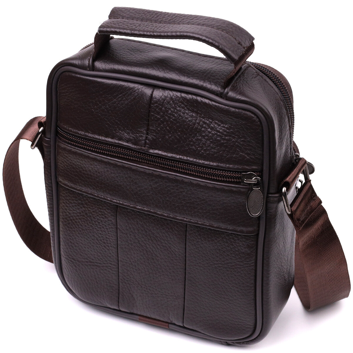 Компактная мужская сумка из натуральной кожи. Аксессуар совсем не прихотлив в уходе и пользуется особой популярностью у мужчин. В изделии использована качественная фурнитура и надежная подкладка. По краям аксессуар прошит ровной строчкой. Сумка станет прекрасным подарком для любого мужчины.