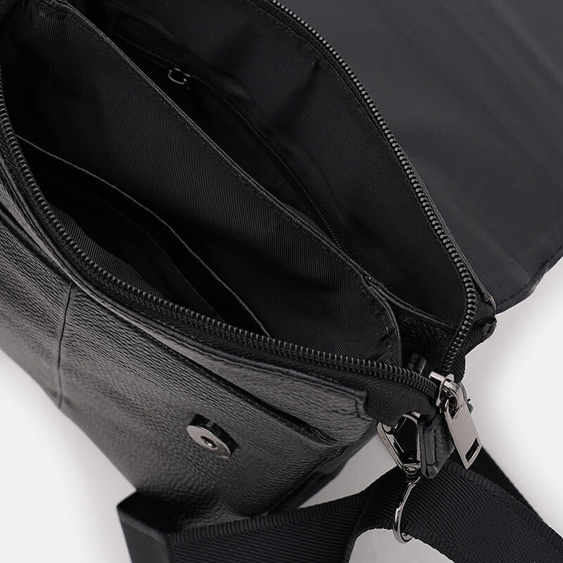 Мужская кожаная сумка закрывается на клапан с кнопками и молнию с внутренней стороны. Имеет 2 отделения, внутри каждого имеется по карману. С тыльной стороны- 1 карман на молнии, с лицевой под клапаном также есть карман. Подкладка текстиль, съемный текстильный ремень регулируется по длине, ручка из натуральной кожи.