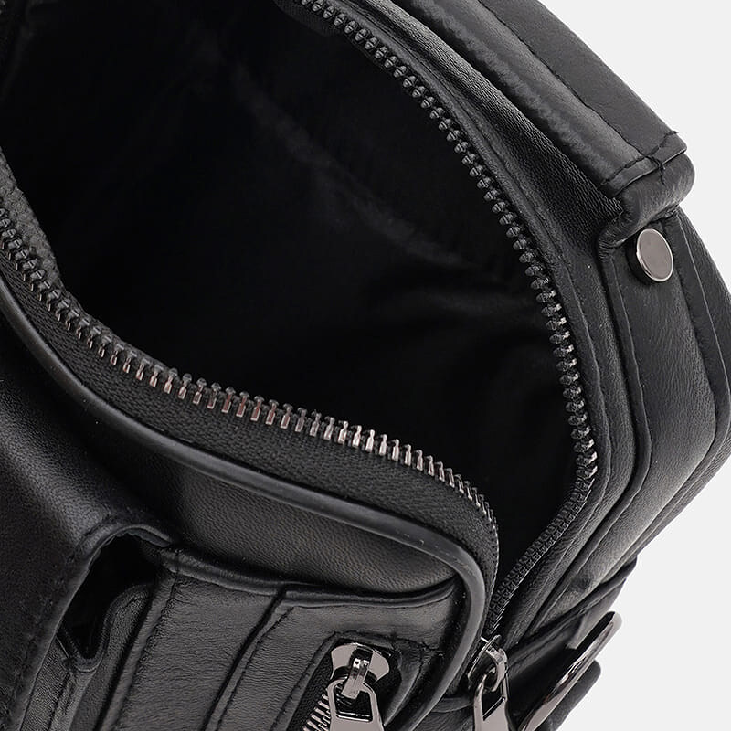 Сумка выполнена из натуральной кожи. Имеет 1 основное отделение на молнии. С лицевой стороны 1 вертикальный карман на молнии и карман на кнопке. С тыльной стороны 1 карман на молнии. Подкладка текстиль. Плечевой ремень из кожи и текстиля регулируется по длине.