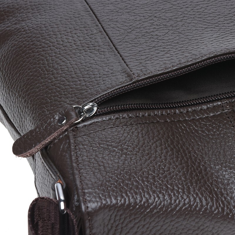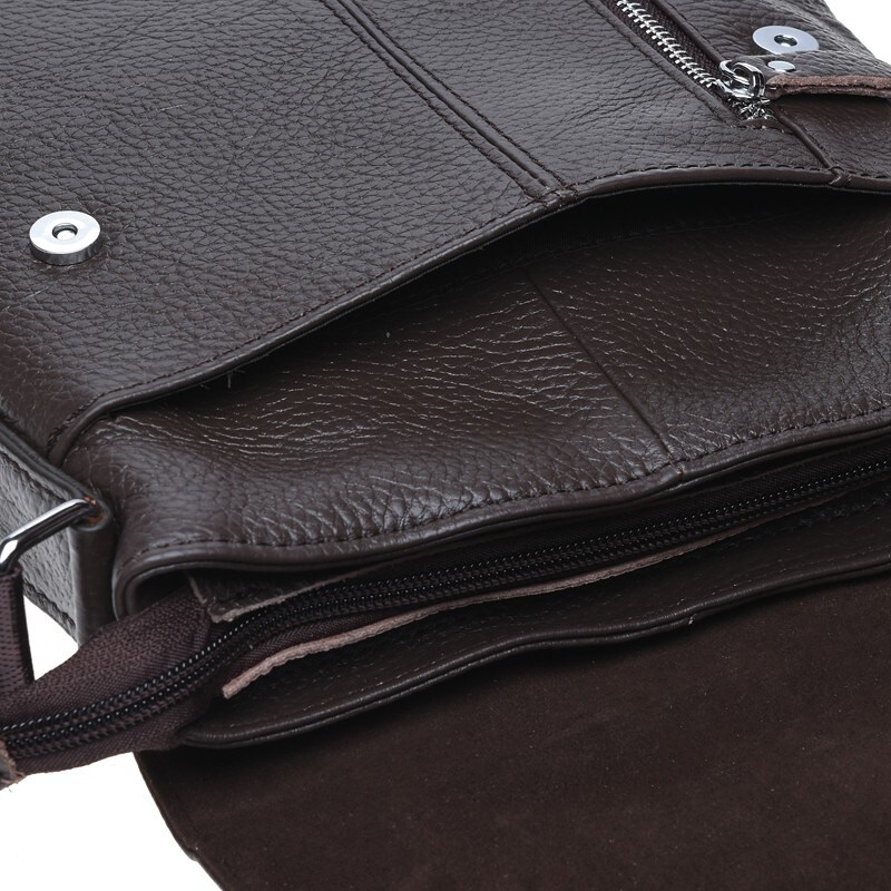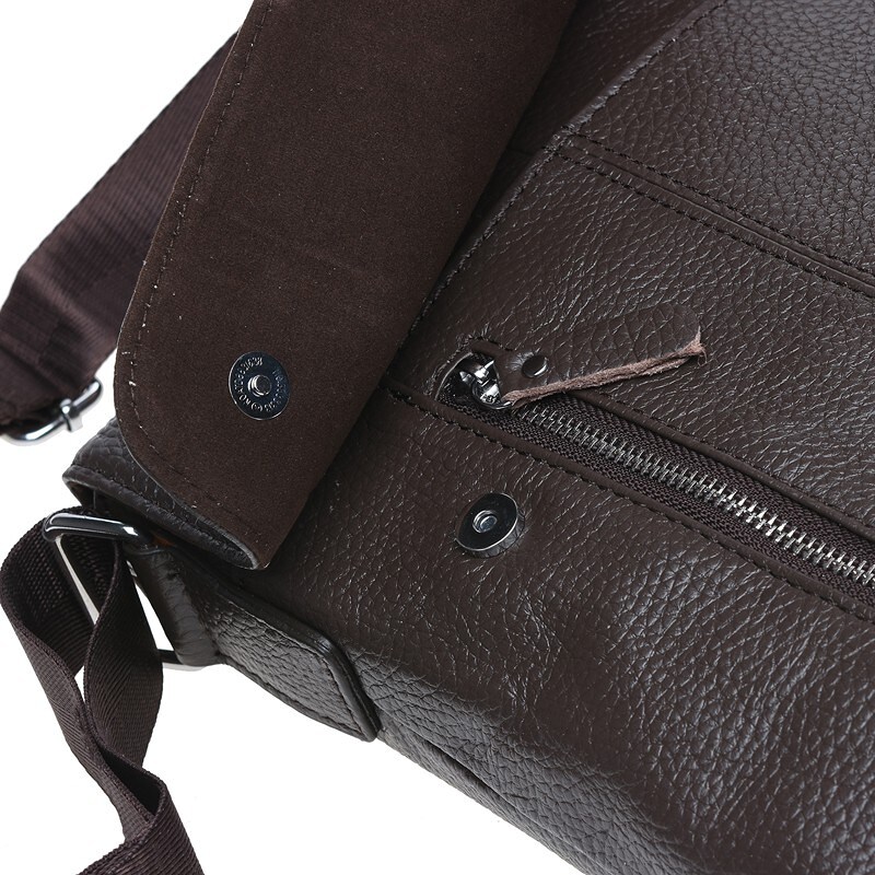 Стильный мессенджер коричневого цвета отлично дополнит гардероб практичных мужчин. Закрывается на клапан с кнопками. Имеет 1 отделение с 3 карманами внутри. С лицевой стороны- 2 кармана. С тыльной стороны -1 карман на молнии. Подкладкка- текстиль. Цвет фурнитуры- серебро. Несъемный ремень регулируется по длине.