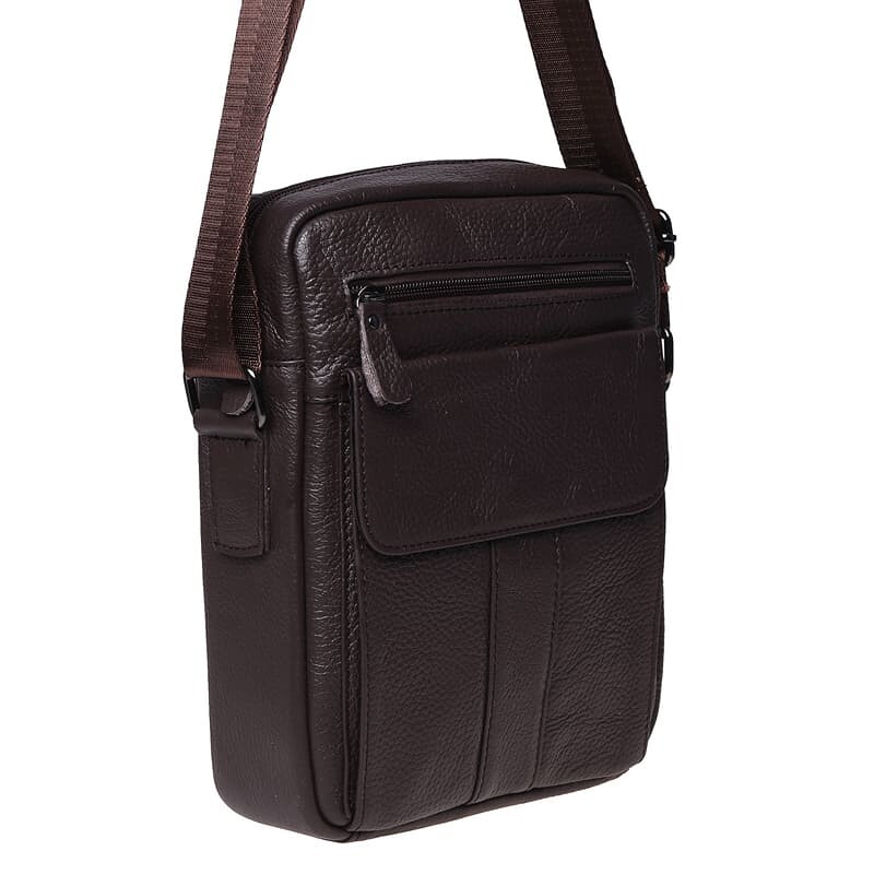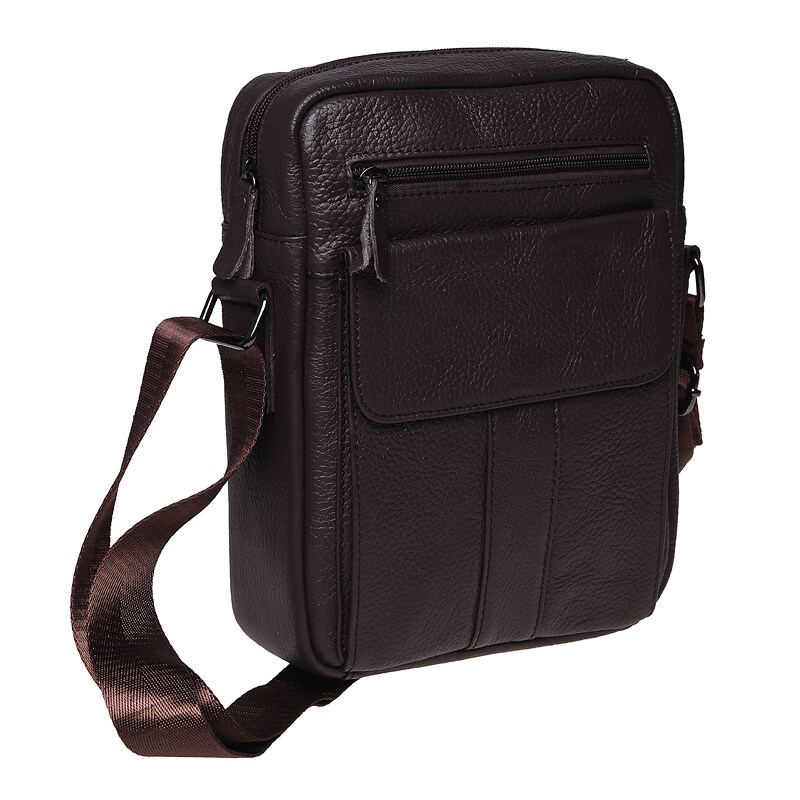 Мужкая кожаная сумка выполнена из натуральной кожи. Имеет 1 основное отделение на молнии. Внутри 3 кармана. Снаружи 1 накладной карман на кнопках и 2 карманf на молнии. Подкладка: текстиль. Цвет фурнитуры серебро.Имеет несъемный плечевой ремень.