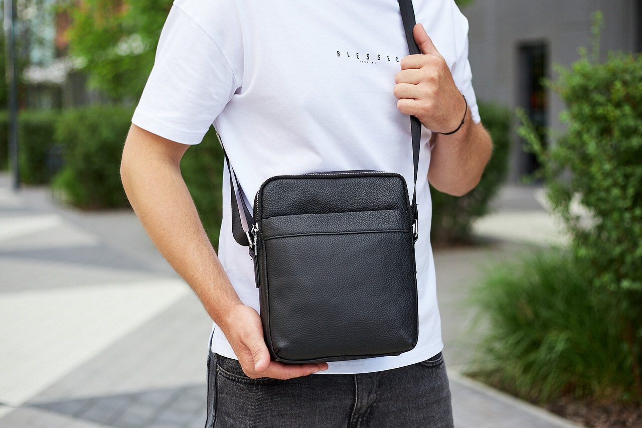 Великолепная мужская сумка вертикального формата, изготовленная из натуральной кожи черного цвета. Она отлично дополнит как деловой, так и повседневный стиль и станет Вашим любимым аксессуаром, благодаря своей практичности. Мужская сумка через плечо черного цвета. У сумки есть два основных отделения, внутри которых есть маленький карман на замке и карман открытого типа , а также с лицевой и тыльной стороны есть два кармана на замке.