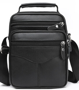 Мужской мессенджер из натуральной кожи, имеет насыщенный черный цвет и отменную металлическую фурнитуру. Также модель оснащена длинным текстильным ремнем, который регулируется по длине и мягкой кожаной ручкой. Кожаная мужская сумка с ручкой имеет два автономных отделения, которые застегиваются с помощью молний. На тыльной стороне сумки расположен один карман на молнии. На своей лицевой части сумки размещены: один достаточно вместительный карман и два дополнительных, вспомогательных, которые так же закрываются посредством молний.
