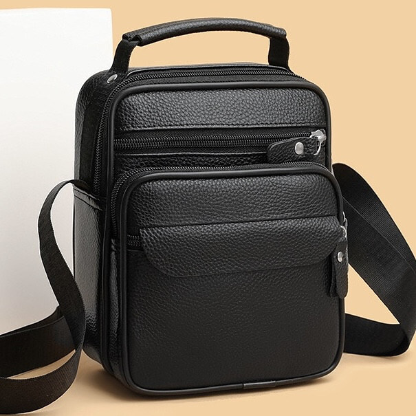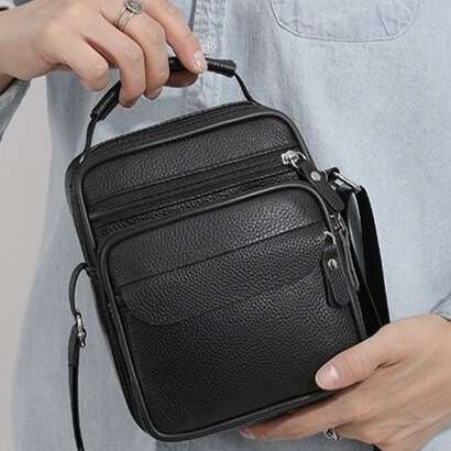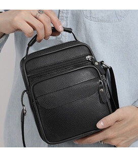 Мужской мессенджер из натуральной кожи, имеет насыщенный черный цвет и отменную металлическую фурнитуру. Также модель оснащена длинным текстильным ремнем, который регулируется по длине и мягкой кожаной ручкой. Кожаная мужская сумка с ручкой имеет два автономных отделения, которые застегиваются с помощью молний. На тыльной стороне сумки расположен один карман на молнии. На своей лицевой части сумки размещены: один достаточно вместительный карман и два дополнительных, вспомогательных, которые так же закрываются посредством молний.