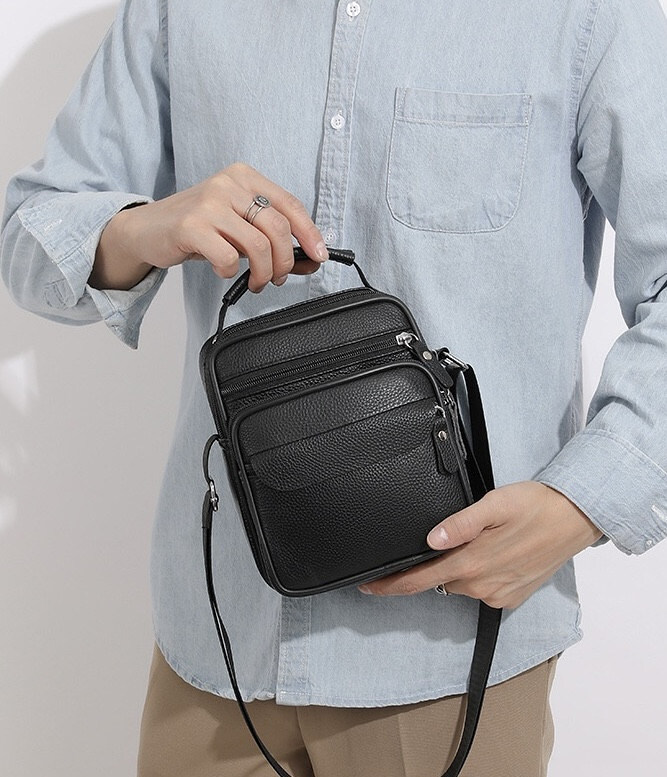 Мужская кожаная барсетка через плечо компактная функциональная с ручкой черная 86802