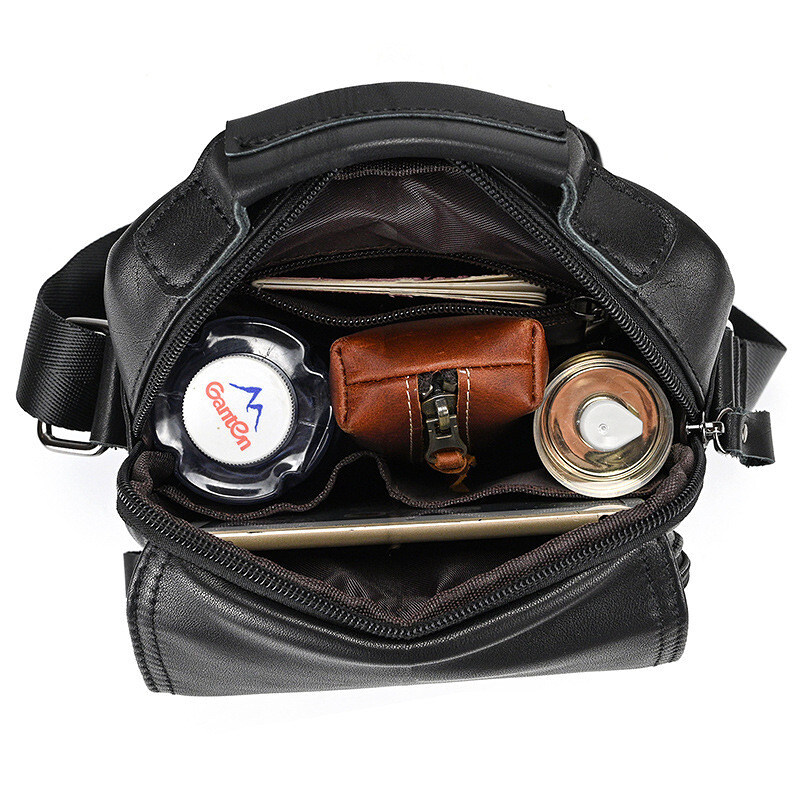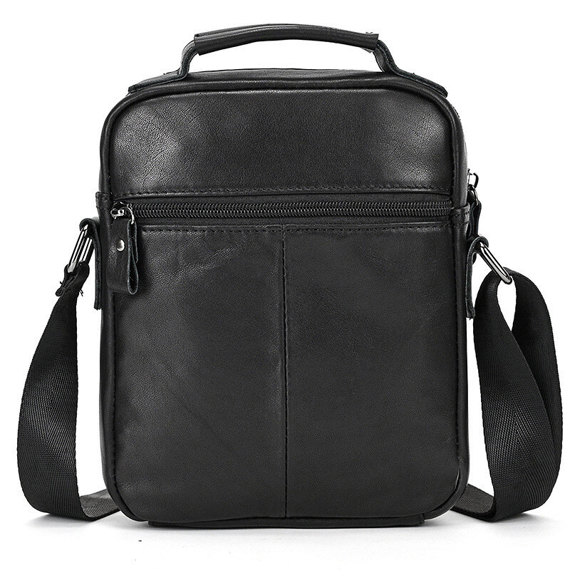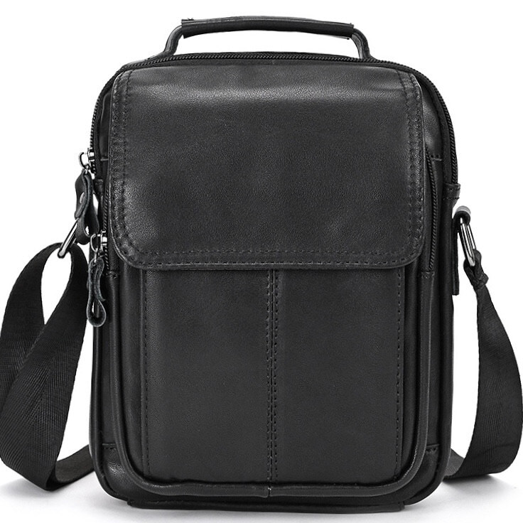 Вместительная мужская сумка через плечо, выполнена из мягкой на ощупь высококачественной натуральной кожи. Два основных отделения равномерны, одно из них имеет потайной карман на молнии, а также карман открытого типа. Между основными отделениями находится дополнительное отделение на магнитной кнопке. С тыльной части сумки находится карман на молнии, а с лицевой части – глубокое отделение без застежки, под накидкой. Отделения застегиваются при помощи качественной фурнитуры. Внутренняя отделка сумки являет собой плотную подкладку. Ремень сумки текстильный, съёмный, надежно крепится при помощи карабина к кольцам по бокам сумки.