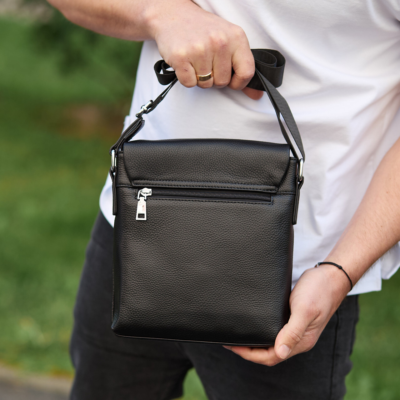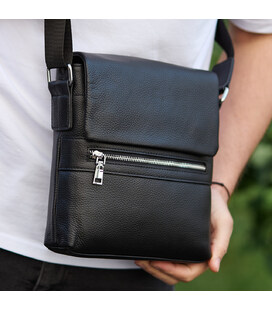 Мужская кожаная сумка через плечо (мессенджер) является очень нужным и практичным аксессуаром для современного мужчины. Эта сумка стильно выглядит, качественно сделана и гармонично подойдет к любому стилю, а благодаря своей форме удобна в использовании. Сумка закрывается на перекидной клапан, под которым находится два основных отделения, закрывающиеся на молнии. Внутри сумки дополнительно есть боковой карман на молнии и два открытых кармана для мелочей. Снаружи под клапаном размещен глубокий открытый карман и карман на молнии. С тыльной стороны - врезной карман на молнии. Подкладка сумки - текстиль. Цвет фурнитуры - серебро. Имеет текстильный регулируемый ремень.
