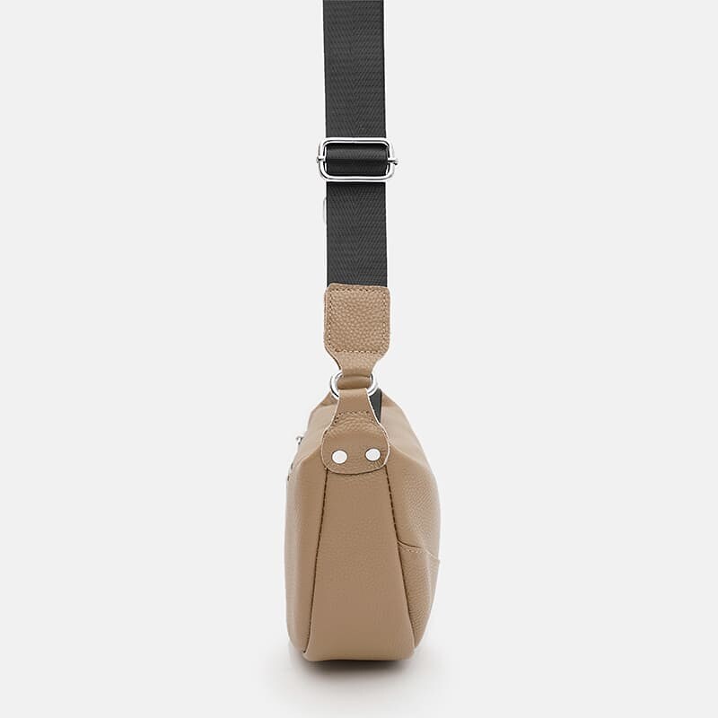 Женская кожаная сумка имеет 1 основное отделение на молнии, внутри – 2 кармана для телефона и других мелочей. С тыльной стороны-1 карман на молнии. Текстиль подкладки. Несъемный текстильный ремень регулируется по длине.