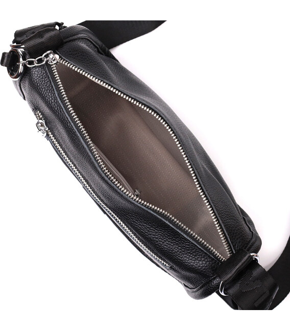Женская полукруглая сумка из натуральной кожи с высоким показателем качества и износостойкости. Аксессуар состоит из основного отделения, что закрывается на молнию, внутри которого находится потайной карман на молнии и карман открытого типа, а также карман на молнии на тыльной стороне снаружи. Носить сумку можно на плече, для этого имеется несъемный регулируемый текстильный ремень. В изделии использована качественная фурнитура серебряного цвета.