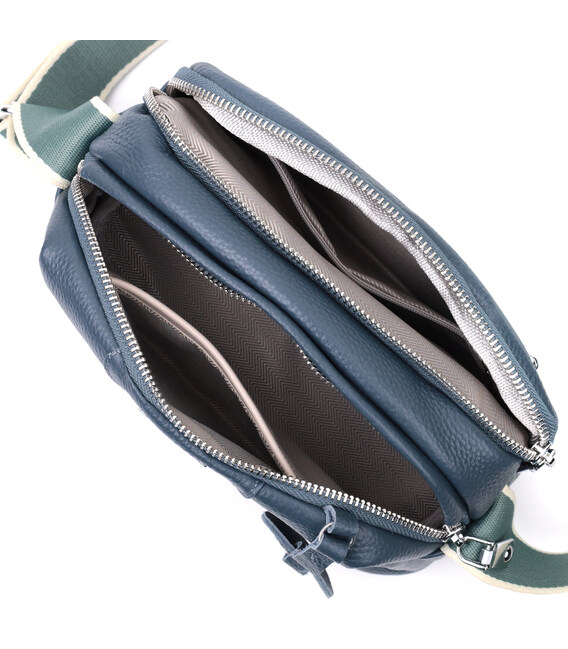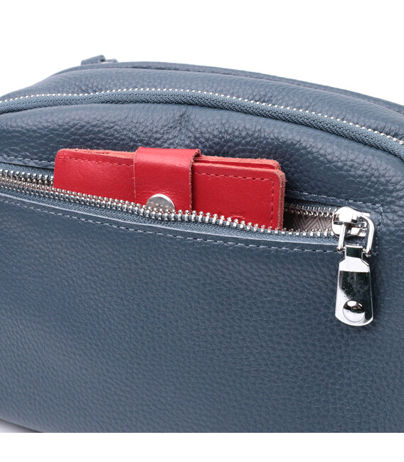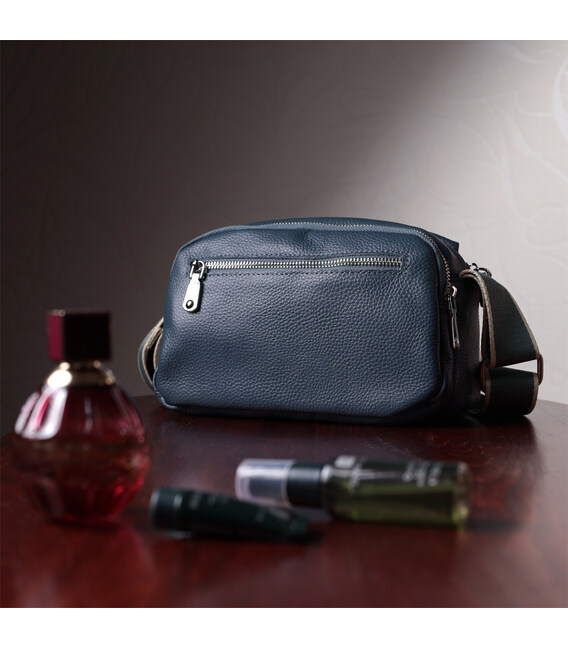 Вместительная сумка для женщин из натуральной кожи. В изделии использована кожа красивого синего цвета. Аксессуар состоит из двух отделений, которые закрываются на молнии, потайного кармана на молнии и кармана открытого типа, а также кармана снаружи на тыльной стороне. Изделие имеет твердое дно, что позволяет держать форму. Носить сумку можно в руке, под рукой, на плече и через плечо, для этого имеется текстильный не съемный ремень. В аксессуаре использована качественная фурнитура цвета серебра. Отличный вариант для подарка близким и дорогим девушкам и женщинам.