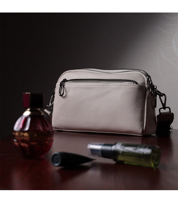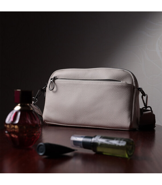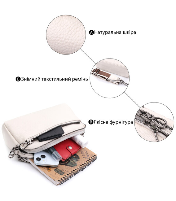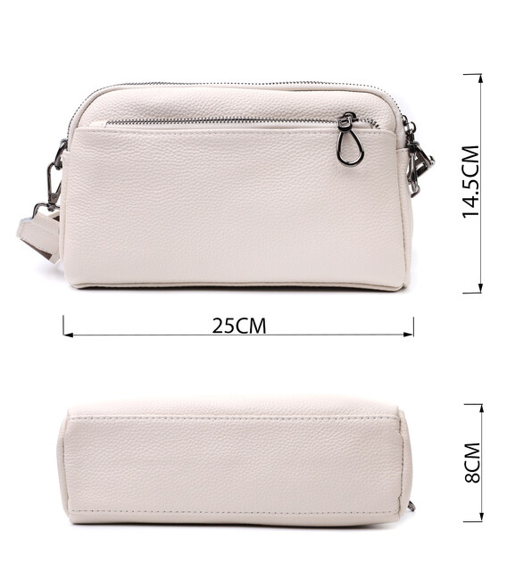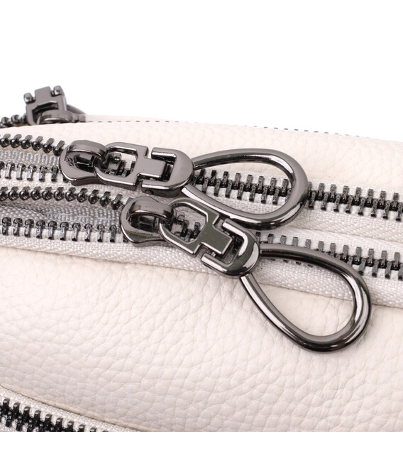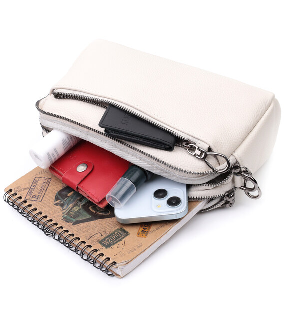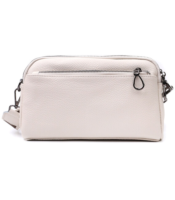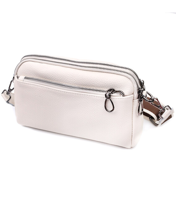 Красивая женская сумка на все случаи из натуральной кожи флотар, которая имеет зернистую фактуру. В изделии использована кожа белого цвета. Аксессуар состоит из двух отделений, которые закрываются на молнии, потайного кармана на молнии и кармана открытого типа, а также двух карманов снаружи на лицевой и тыльной стороне. Носить сумку можно в руке, под рукой, на плече и через плечо, для этого имеется текстильный съемный ремень. В аксессуаре использована качественная фурнитура цвета темного серебра. Отличный вариант для подарка близким и дорогим девушкам и женщинам.