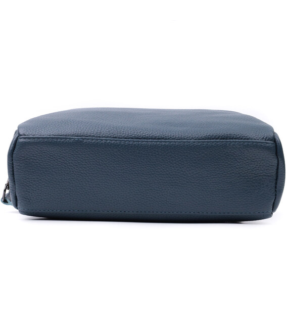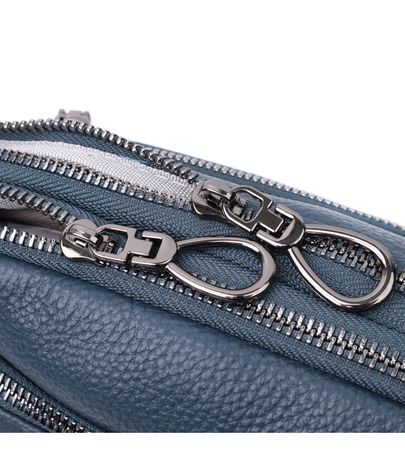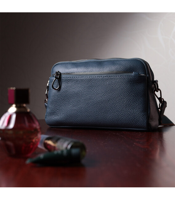 Практичная женская сумка на все случаи из натуральной кожи флотар, которая имеет зернистую фактуру. В изделии использована кожа синего цвета. Аксессуар состоит из двух отделений, которые закрываются на молнии, потайного кармана на молнии и кармана открытого типа, а также двух карманов снаружи на лицевой и тыльной стороне. Носить сумку можно в руке, под рукой, на плече и через плечо, для этого имеется текстильный съемный ремень. В аксессуаре использована качественная фурнитура цвета темного серебра. Отличный вариант для подарка близким и дорогим девушкам и женщинам.