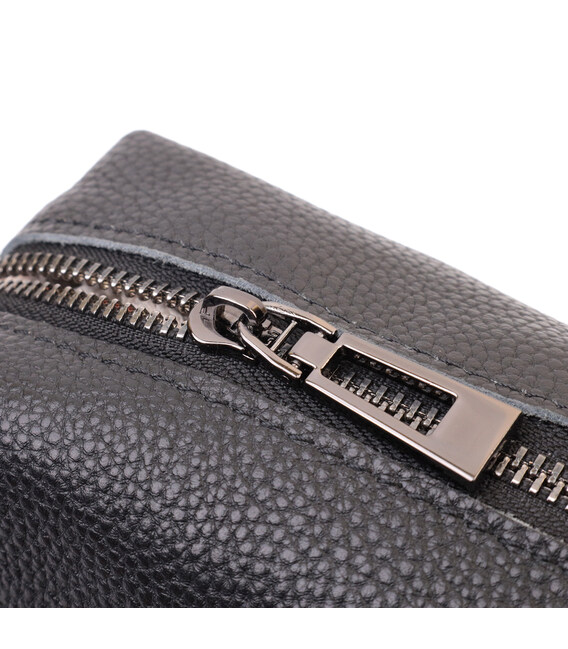 Женская сумка в классическом черном цвете на все случаи из натуральной качественной кожи. Аксессуар состоит из основного отделения, которое закрывается на молнию, а также двух карманов снаружи на лицевой и тыльной стороне. Носить сумку можно в руке, под рукой, на плече и через плечо, для этого имеется текстильный не съемный ремень. В аксессуаре использована качественная фурнитура цвета темного серебра. В нашем магазине Вы сможете приобрести качественный кожаный аксессуар который всегда порадует женщину любого возраста.
