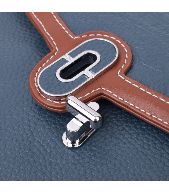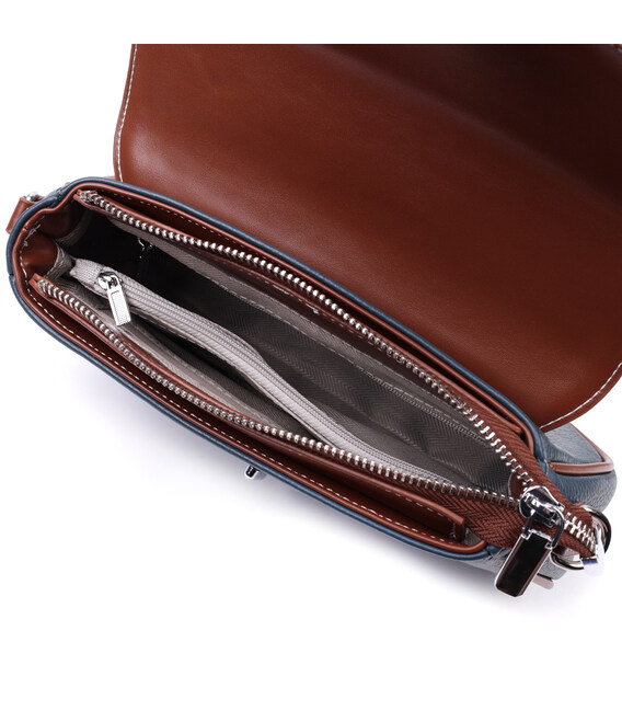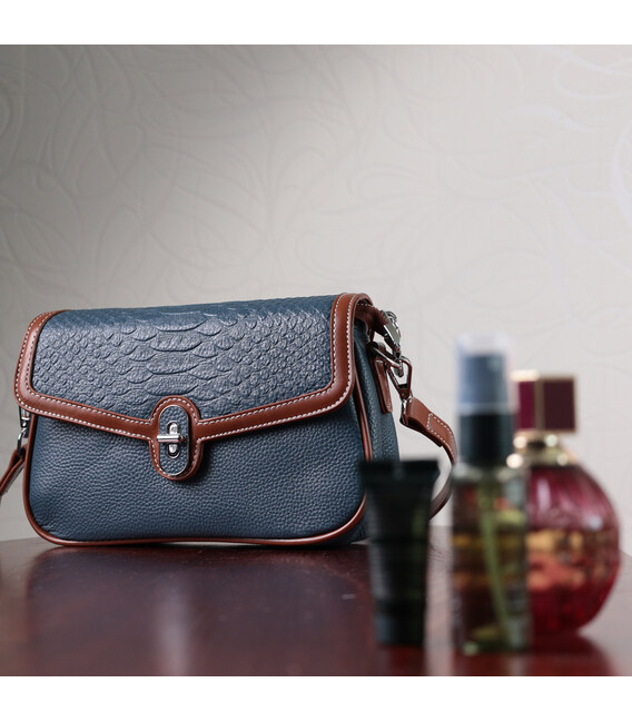 Практичная каркасная женская сумка из натуральной кожи. В изделии использована кожа синего и коричневого цвета. Притягивает взгляд в изделии фактурный клапан с тиснением под змею и изящная механическая защелка. Аксессуар состоит из основного отделения, кармана-перегородки на молнии, потайного кармана на молнии и кармана открытого типа, а также еще одного кармана снаружи, на тыльной стороне. Носить сумку можно в руке, под рукой, на плече и через плечо, для этого имеется кожаный съемный ремень. В аксессуаре использована качественная фурнитура цвета серебра. Универсальный вариант сумки на вечер, на каждий день, а также отлично будет сочетаться с деловым стилем.