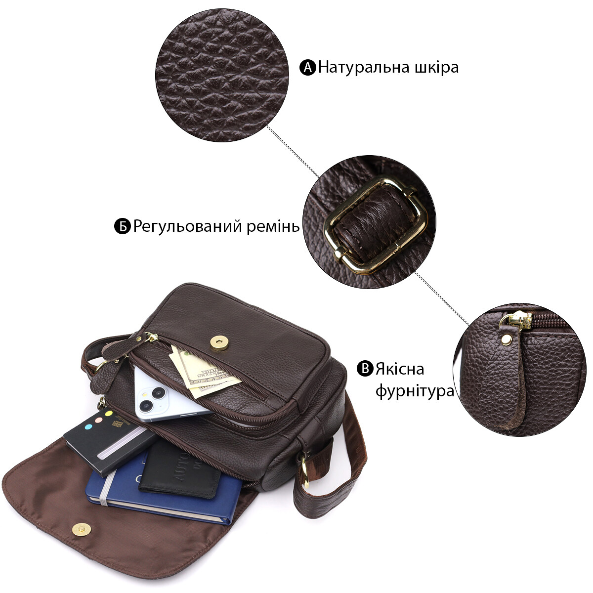 Эта кожаная сумка на плечо — идеальный выбор для женщин, которые ценят практичность, стиль и порядок в каждой детали.