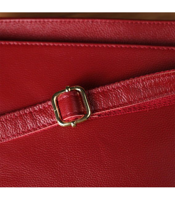 Фурнитура выполнена в цвете жёлтого золота, что выгодно контрастирует с ярким красным цветом кожи и придаёт модели изысканный и благородный вид.