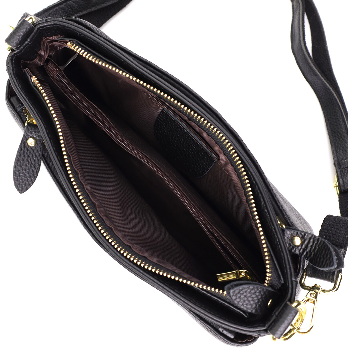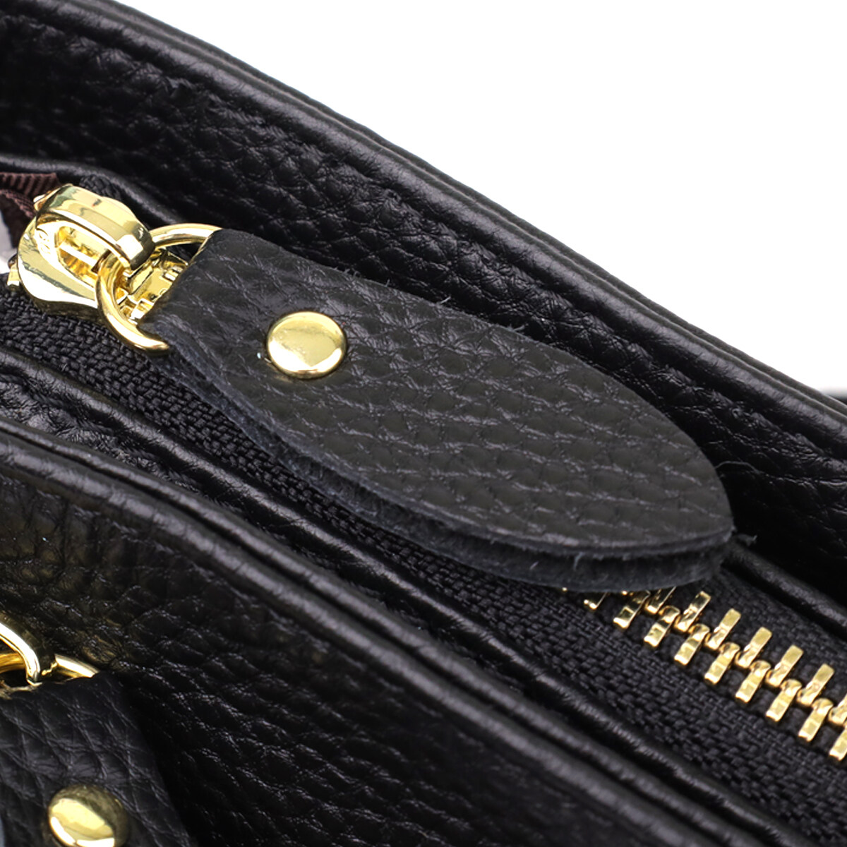 Фурнитура выполнена в тёплом цвете жёлтого золота, создающем элегантный контраст с насыщенным чёрным цветом кожи и подчёркивающем высокий уровень качества изделия.
