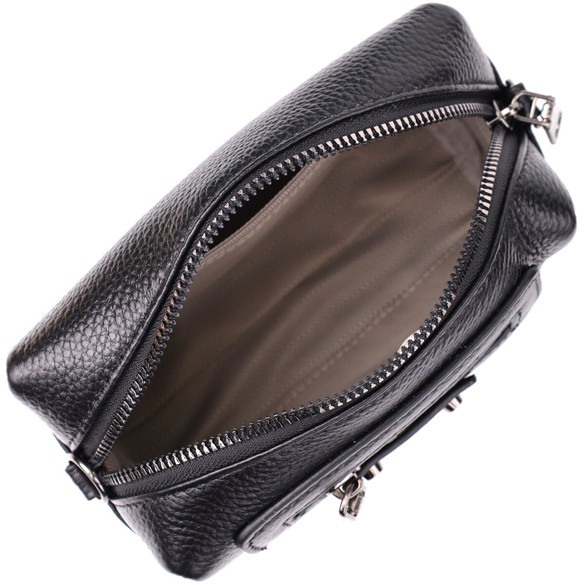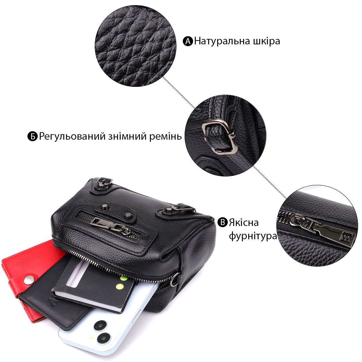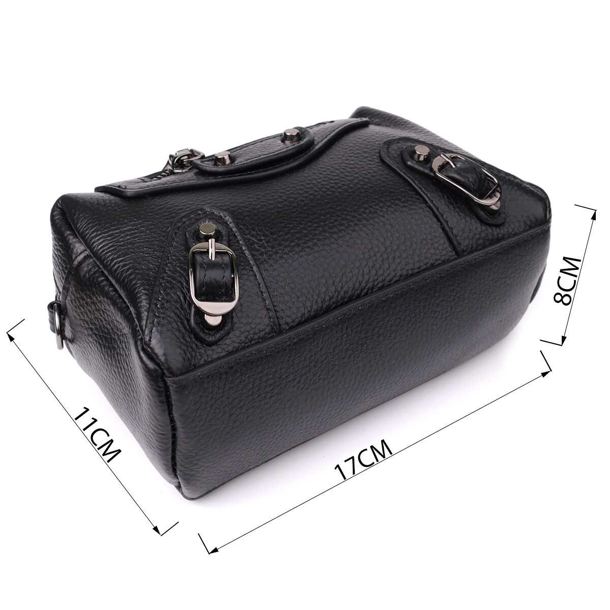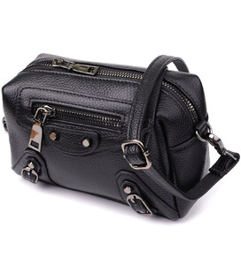 Небольшая женская кожаная сумка с декоративными элементами — стильная деталь для смелого образа. Эта компактная модель сразу привлекает внимание за счёт эффектного дизайна: черная натуральная кожа дополнена выразительными металлическими элементами, декоративной строчкой и акцентной фурнитурой. Стильный внешний карман на молнии обрамлен заклёпками и декоративными ремешками, придавая аксессуару лёгкую брутальность и характер.