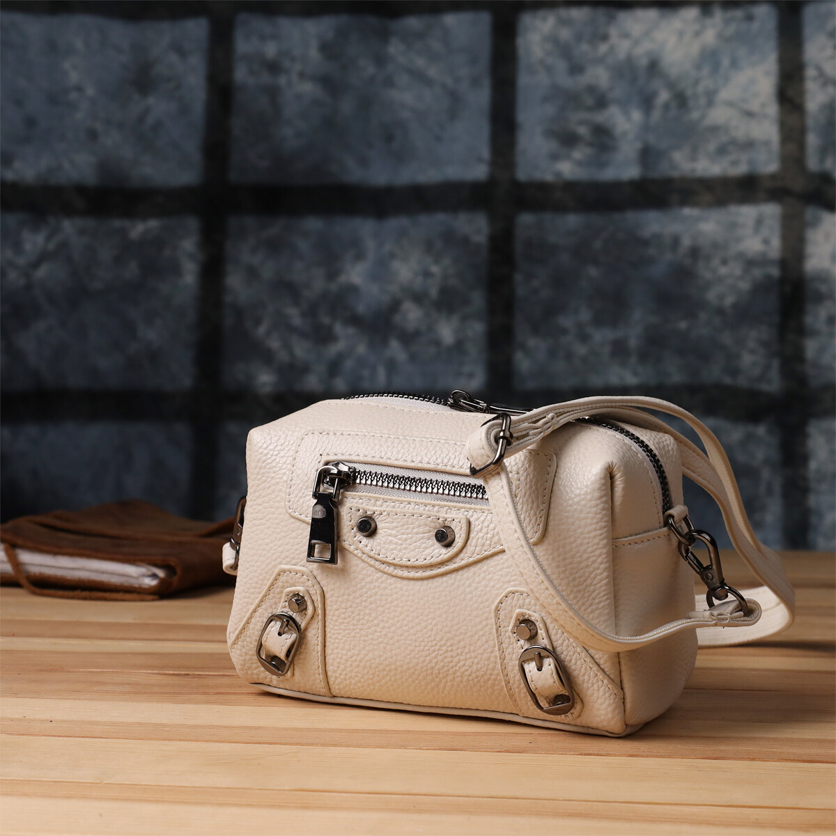 Небольшая женская кожаная сумка в белом цвете с декоративной фурнитурой — эффектный акцент с характером. Сумка выполнена из натуральной кожи в универсальном и выразительном белом цвете, который делает образ светлым, свежим и актуальным. Декоративные элементы играют ключевую роль в дизайне: металлические заклепки, ремешки и фигурная строчка на лицевой стороне придают аксессуару современный, слегка дерзкий вид.