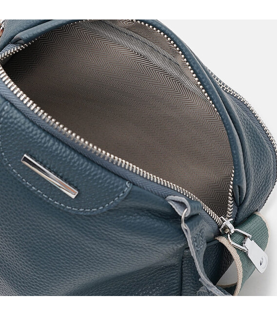 Женская кожаная сумка имеет 2 основных отделения на молнии, с внешней стороны – 1 карман на молнии, внутри сумки – 2 кармана для телефона и других мелочей. Текстиль подкладки. Несъемный текстильный ремень регулируется по длине.