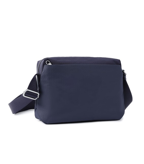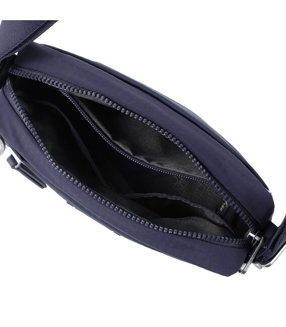 Удобная, компактная сумка через плечо изготовлена из переработанной ткани в сочетании с эко-кожей. Оснащена основным отделением на молнии с отделом для смартфона и дополнительным карманом на молнии с RFID-защитой. На заднем кармане изделия предусмотрена утопленная молния, плотно прилегающая к телу, как дополнительное средство безопасности. Имеет регулируемый по длине ремень.
