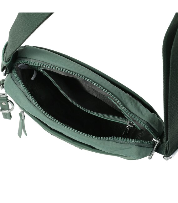 Удобная, компактная сумка через плечо изготовлена из переработанной ткани в сочетании с эко-кожей. Оснащена основным отделением на молнии с отделом для смартфона и дополнительным карманом на молнии с RFID-защитой. На заднем кармане изделия предусмотрена утопленная молния, плотно прилегающая к телу, как дополнительное средство безопасности. Имеет регулируемый по длине ремень.