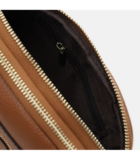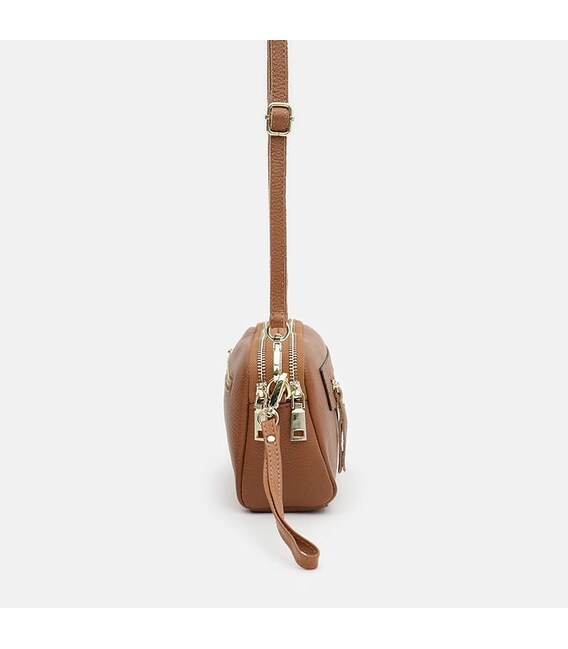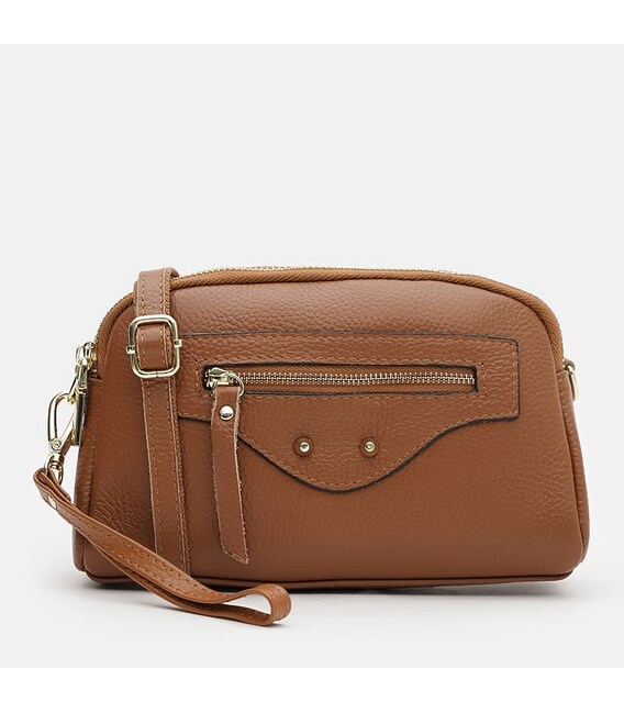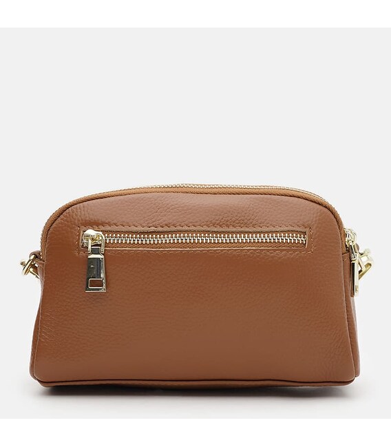 Женская кожаная сумка выполнена из прочной кожи. Имеет 2 отделения на молниях. Внутри 1 карман на молнии. С наружней стороны 2 кармана на молниях. Подкладка текстиль. Съемный плечевой ремень из кожи.