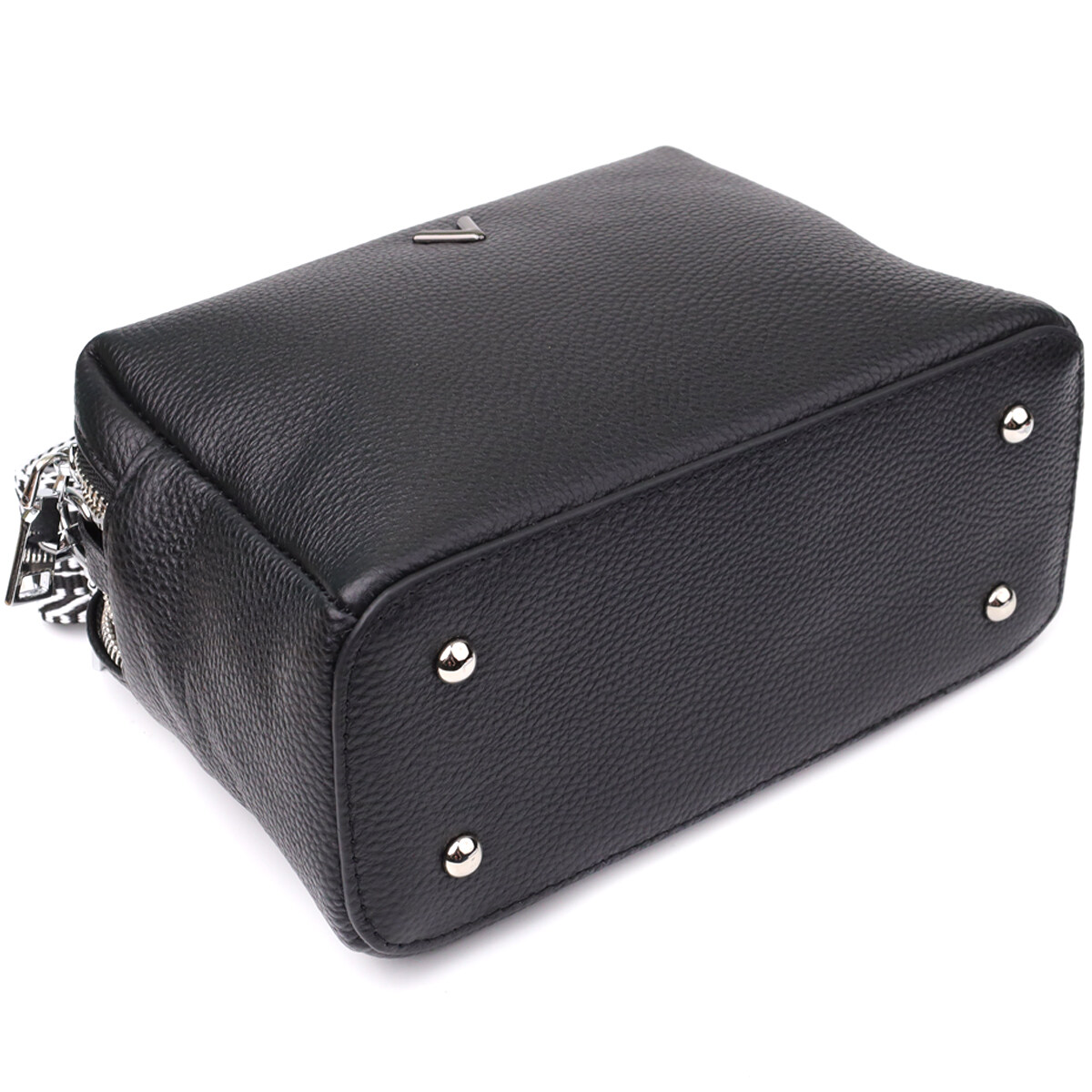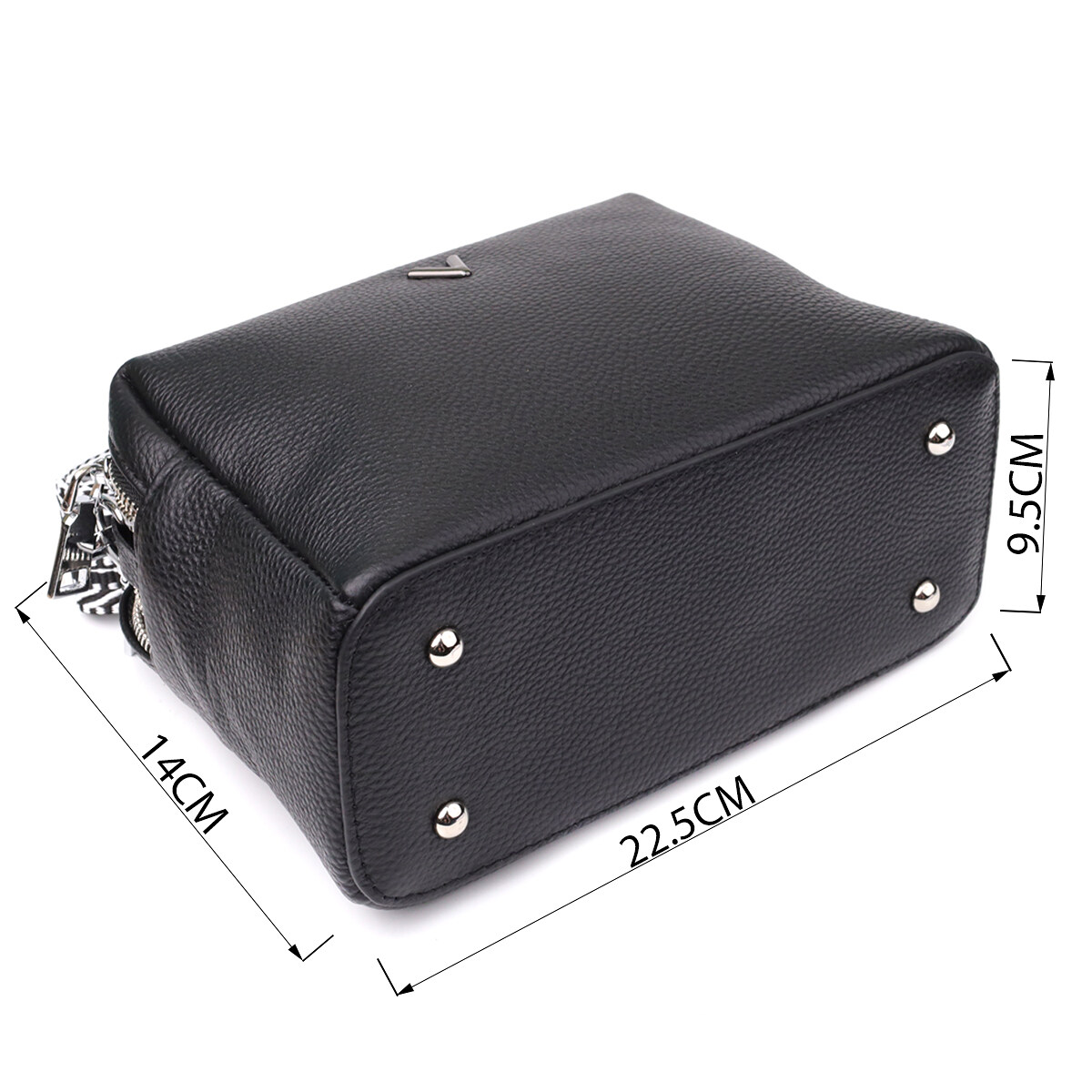 Особое внимание уделено деталям: на дне расположены металлические ножки, которые защищают изделие от повреждений и продлевают срок его службы. Фурнитура в цвете серебра добавляет изящности и делает образ более собранным и современным. Модель дополнена съемным текстильным ремнем с регулировкой по длине, что позволяет комфортно носить сумку как на плече, так и через плечо.