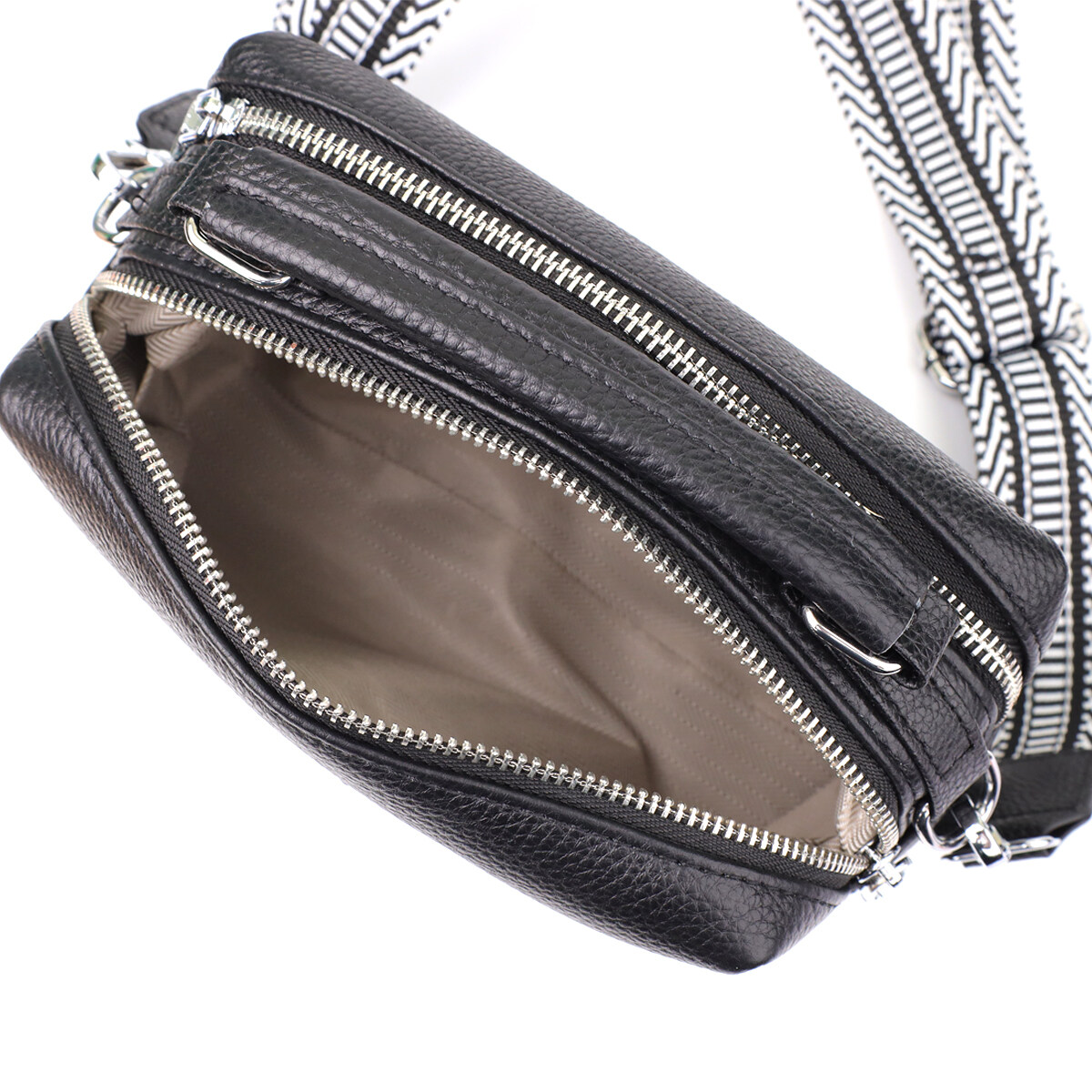 Сумка имеет два основных отделения, которые закрываются на молнии, что обеспечивает надежную организацию пространства. Внутри расположен потайной карман на молнии — идеальное решение для хранения мелочей, документов или личных вещей.