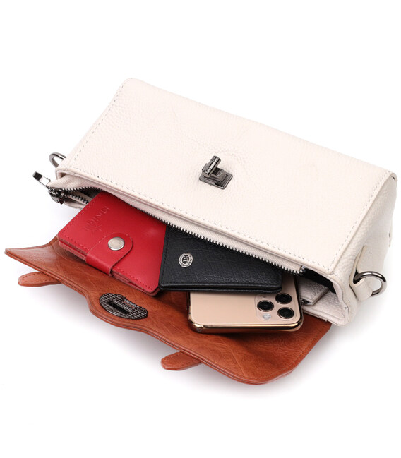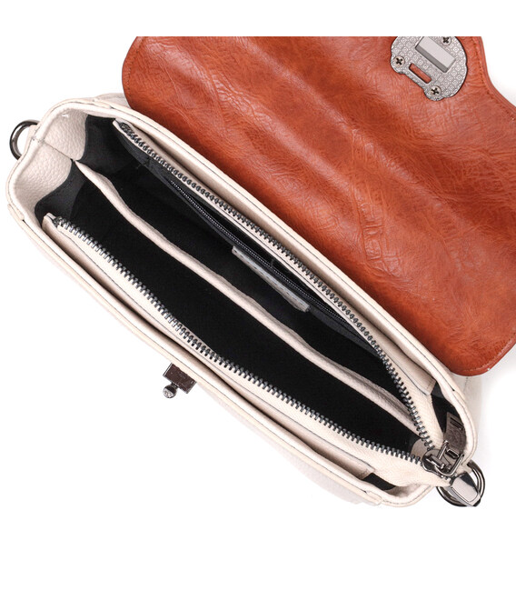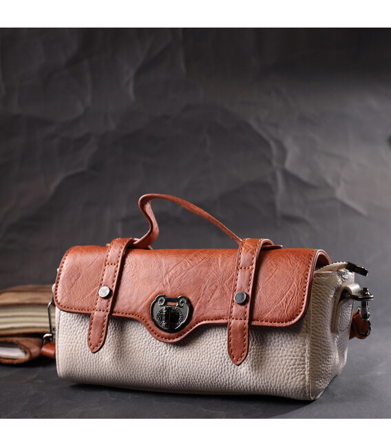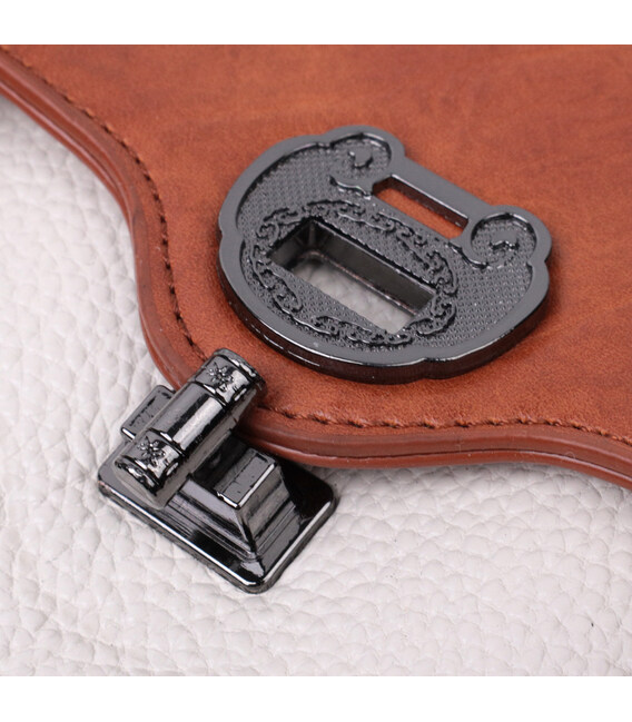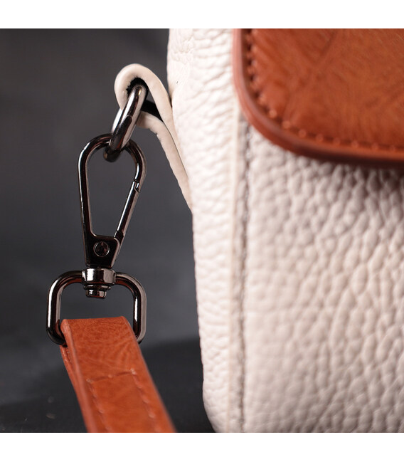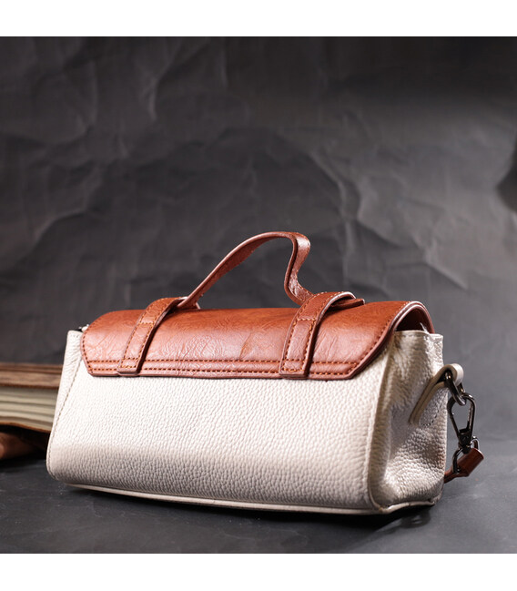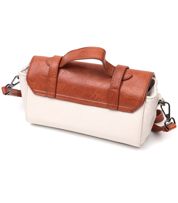 Привлекательная сумочка в винтажном стиле, которая закрывается на молнию и стильный клапан. Акцентом данной сумочки есть не только форма но и сочетание двух цветов белого и коричневого, такая цветовая гамма придает элегантности и стиля аксессуару. Носить сумку можно в руке, на плече и через плечо, для этого имеются кожаная ручка и кожаный съемный регулируемый ремешок. В изделии использована качественная фурнитура темно-серебряного цвета. Универсальный вариант сумки который подойдет для вечера, а также отлично подойдет на каждый день.