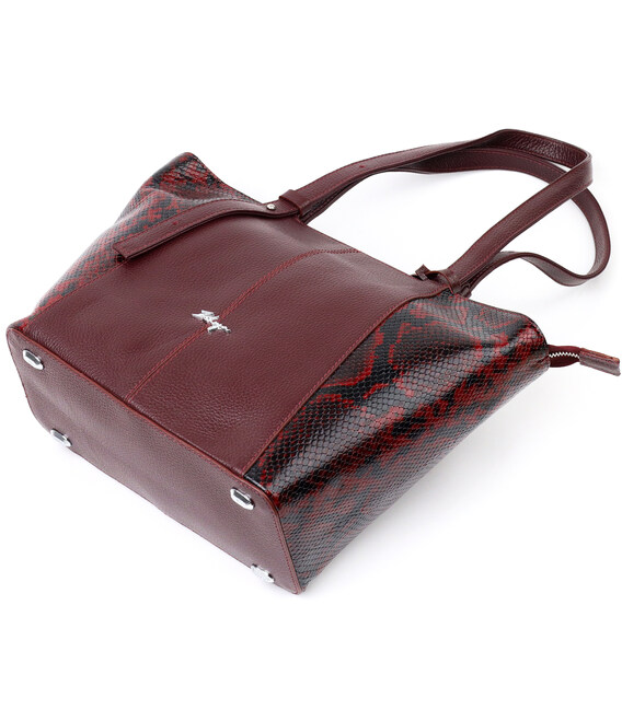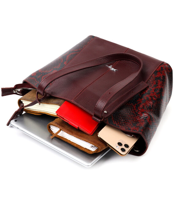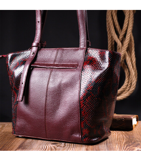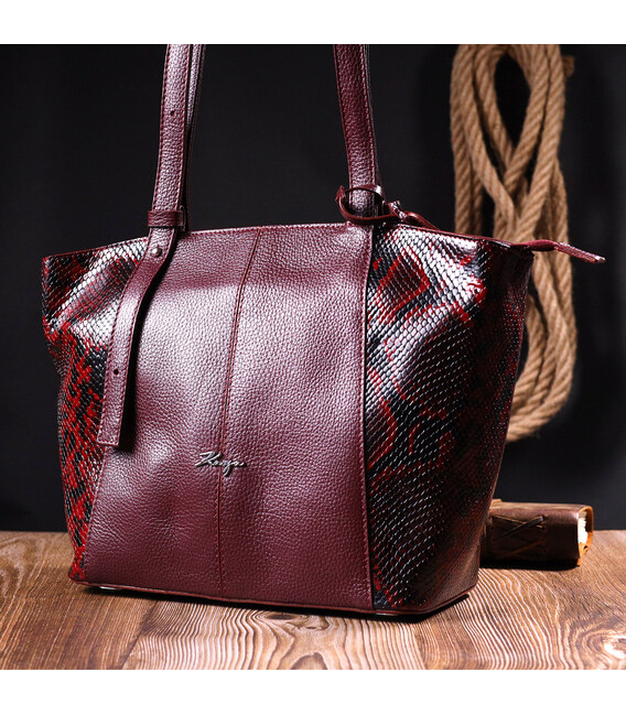 Интересная женская сумка из натуральной фактурной кожи с тиснением под змею и вставкой с мелкозернистой натуральной кожи. Сумка функциональна и удобна в эксплуатации, качественная фурнитура не только дополняет стильный дизайн сумки, но и защищает изделие. Аксессуар упакован в фирменный текстильный мешок Karya. Сумка из натуральной кожи всегда будет отличным подарком любой женщине.