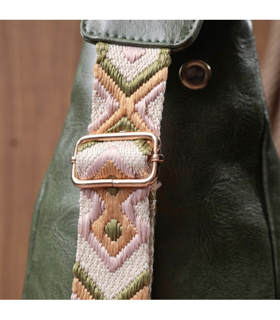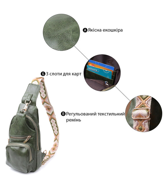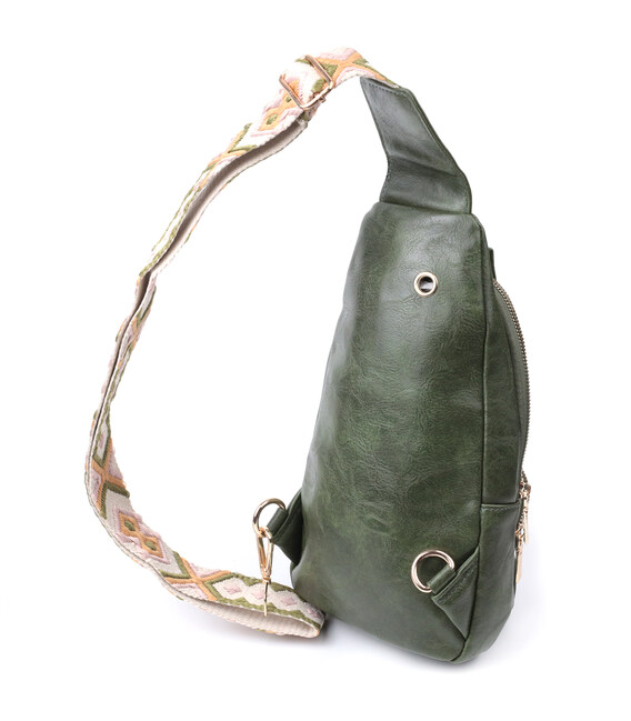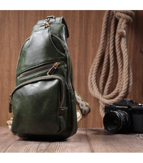 Экокожа - высококачественная альтернатива натуральному материалу, которая очень устойчива к трению, к низким температурам, отлично носится в отличии от других искусственных материалов, а также имеет гипоаллергенный состав в отличии от натуральной кожи. Предлагаем Вашему вниманию удобную слинг сумку из экокожи в модном зеленом цвете. Данная модель состоит из одного основного отделения которое закрывается на молнию и в котором находится карман на молнии и три кармана для кредитных карт, а также трех карманов снаружи и одного отверстия для кабеля или наушников, что очень удобно в современной мире. Основной фишкой модели является удобный регулируемый плечевой ремешок в этническом стиле, что очень модно уже несколько сезонов.