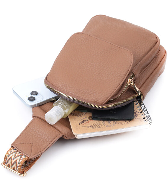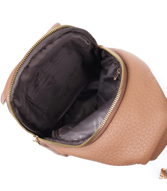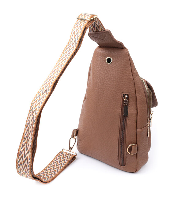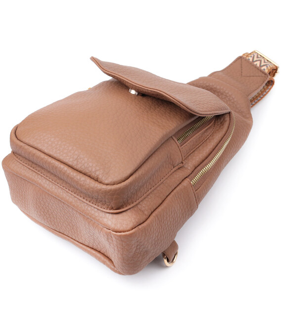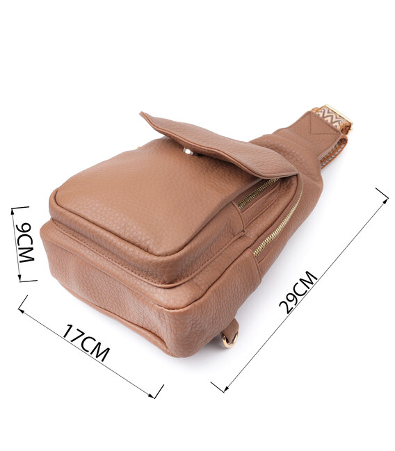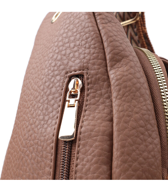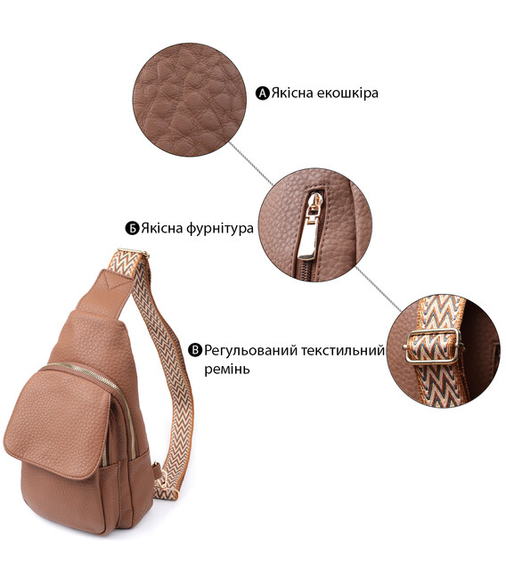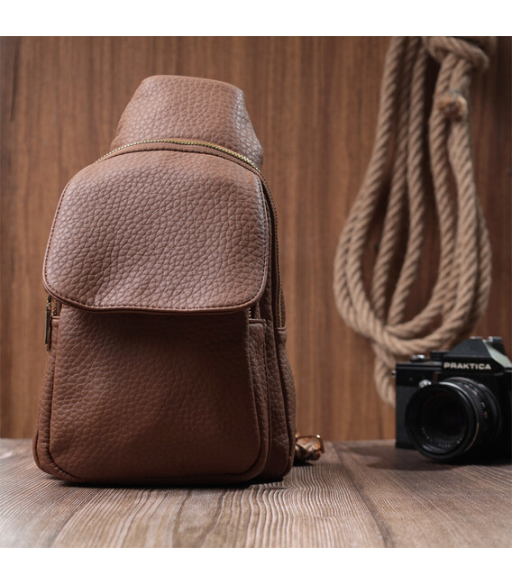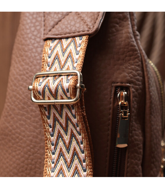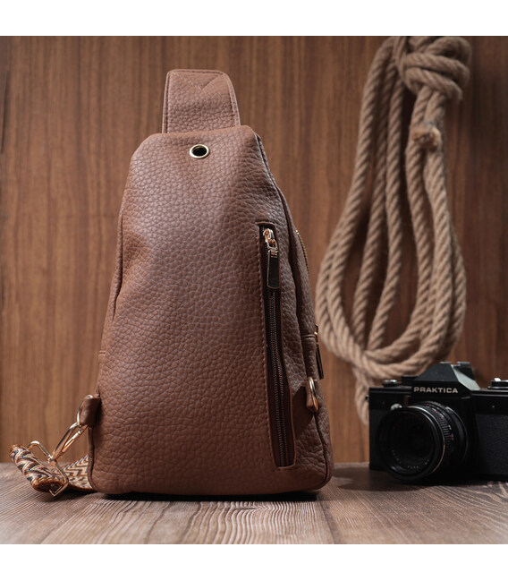 Практичная женская слинг сумка из зернистой экокожи в стильном коричневом цвете. Данная модель состоит из одного основного отделения которое закрывается на молнию и в котором находится карман на молнии и четыре кармана для кредитных карт внутри, а также двух карманов снаружи и одного отверстия для кабеля или наушников, что очень удобно в современной мире. Акцентом данной модели является удобный регулируемый плечевой ремешок в этническом стиле, что очень модно уже несколько сезонов. Экокожа - высококачественная альтернатива натуральному материалу, которая очень устойчива к трению, к низким температурам, отлично носится в отличии от других искусственных материалов, а также имеет гипоаллергенный состав в отличии от натуральной кожи.