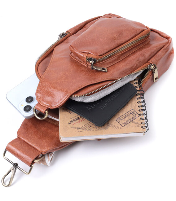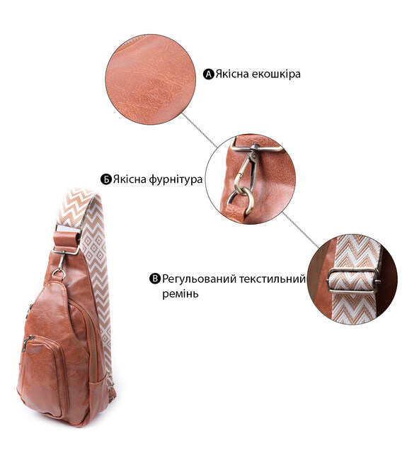 Стильная слинг сумка для женщин из красивой фактурной экокожи. Данная модель состоит из одного основного отделения которое закрывается на молнию и в котором находится два кармана открытого типа внутри, а также двух карманов снаружи и одного отверстия для кабеля или наушников, что очень удобно в современной мире. Акцентом данной модели является удобный регулируемый плечевой ремешок в этническом стиле, что очень модно уже несколько сезонов. Экокожа - высококачественная альтернатива натуральному материалу, которая очень устойчива к трению, к низким температурам, отлично носится в отличии от других искусственных материалов, а также имеет гипоаллергенный состав в отличии от натуральной кожи. Отличный вариант сумки, который порадует любую девушку, так как все вещи под рукой и в безопасности.