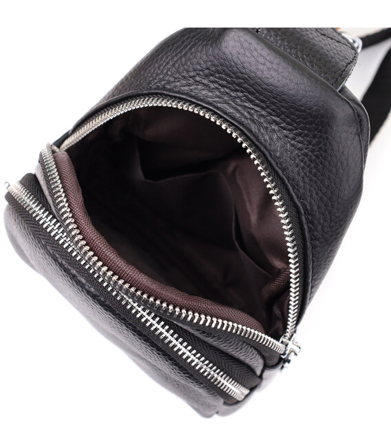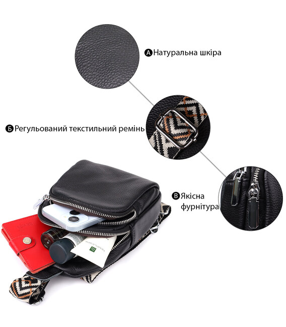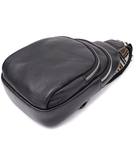 Особое внимание заслуживает регулируемый текстильный ремень с ярким стильным узором — он не только обеспечивает комфортную посадку на теле, но и становится выразительным элементом дизайна. Ремень несъёмный, но легко регулируется под ваш рост и способ ношения. Фурнитура выполнена в серебристом цвете, что придаёт аксессуару современный и сдержанный блеск, прекрасно сочетающийся с текстурой кожи и акцентами ремня.
