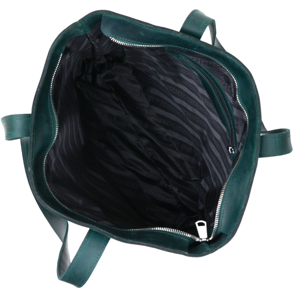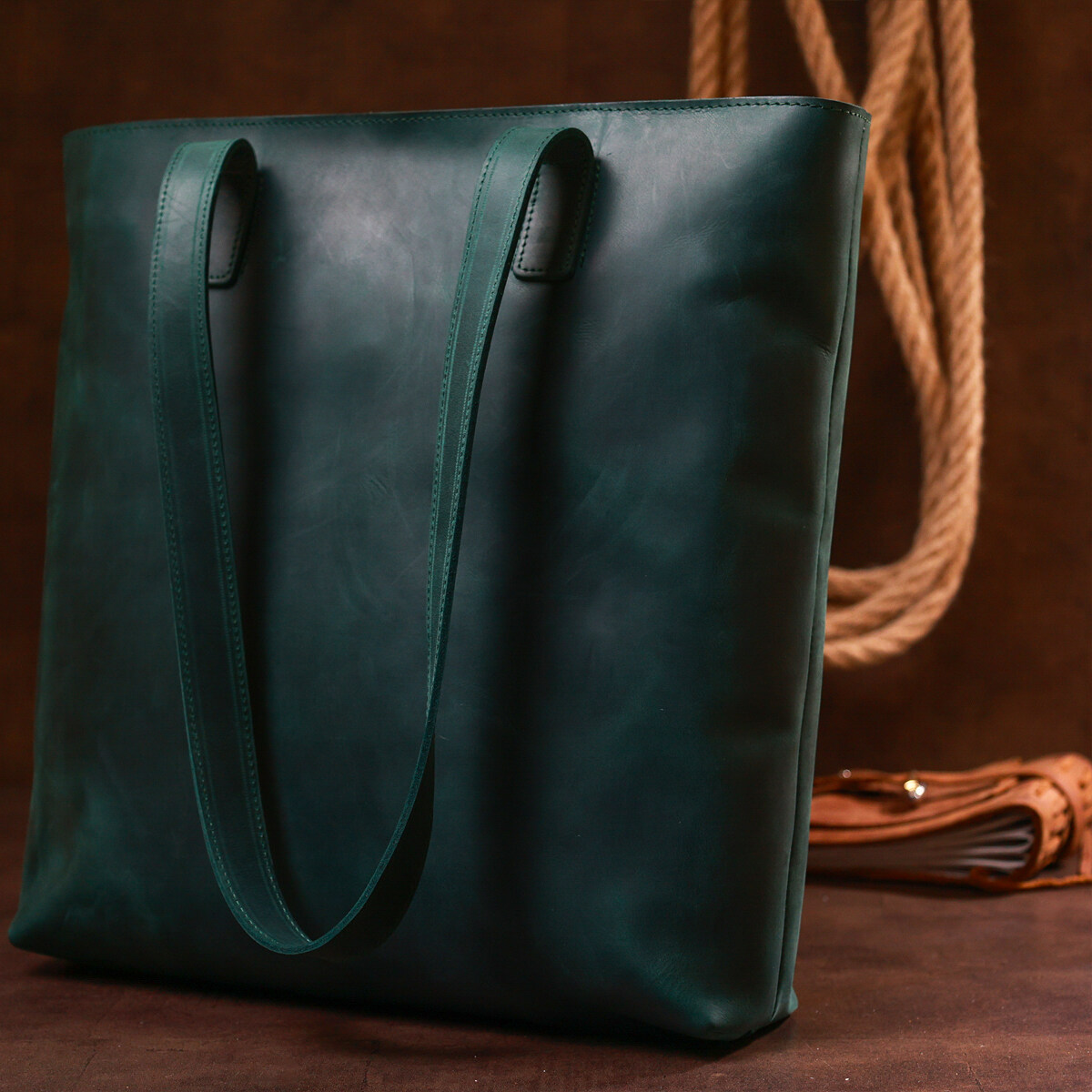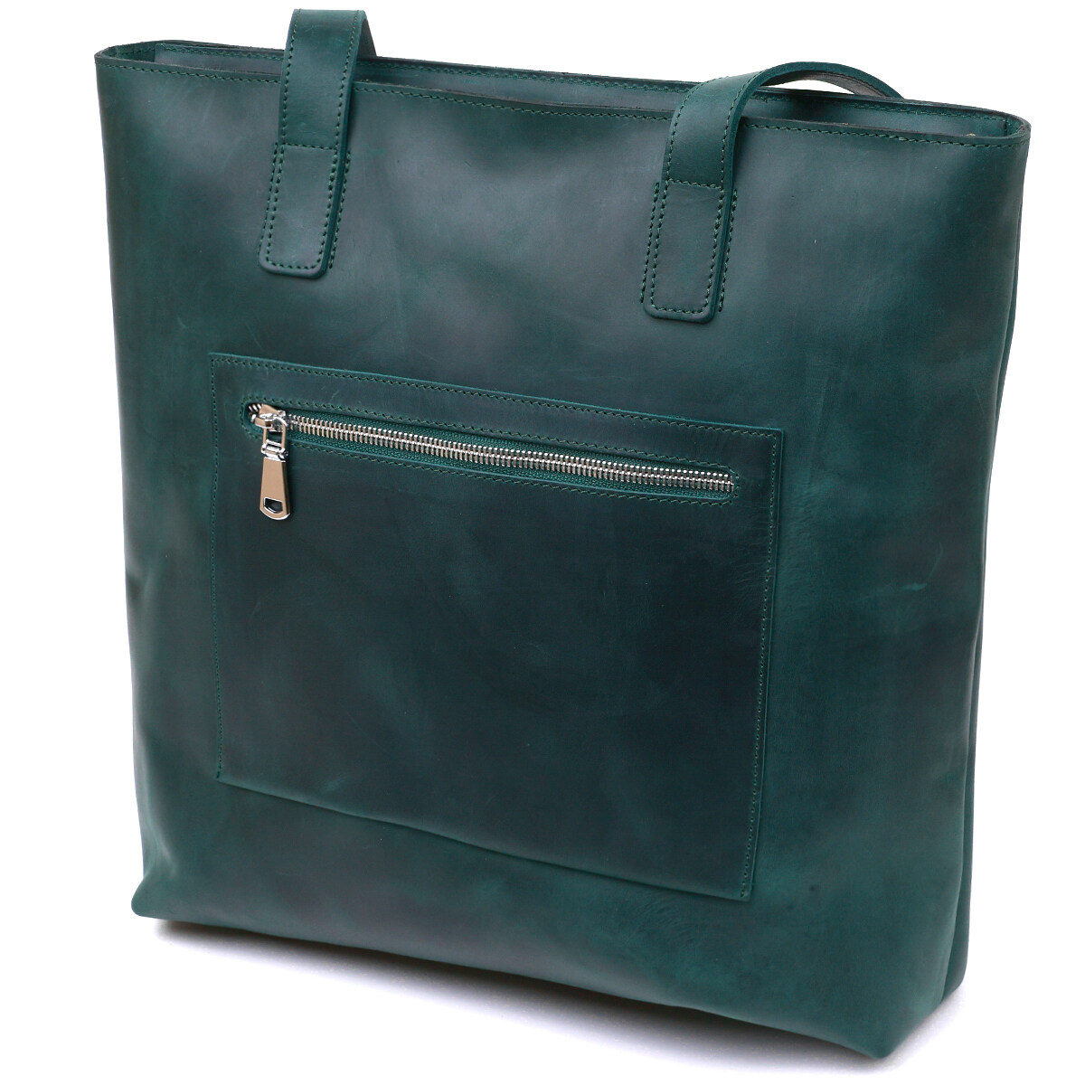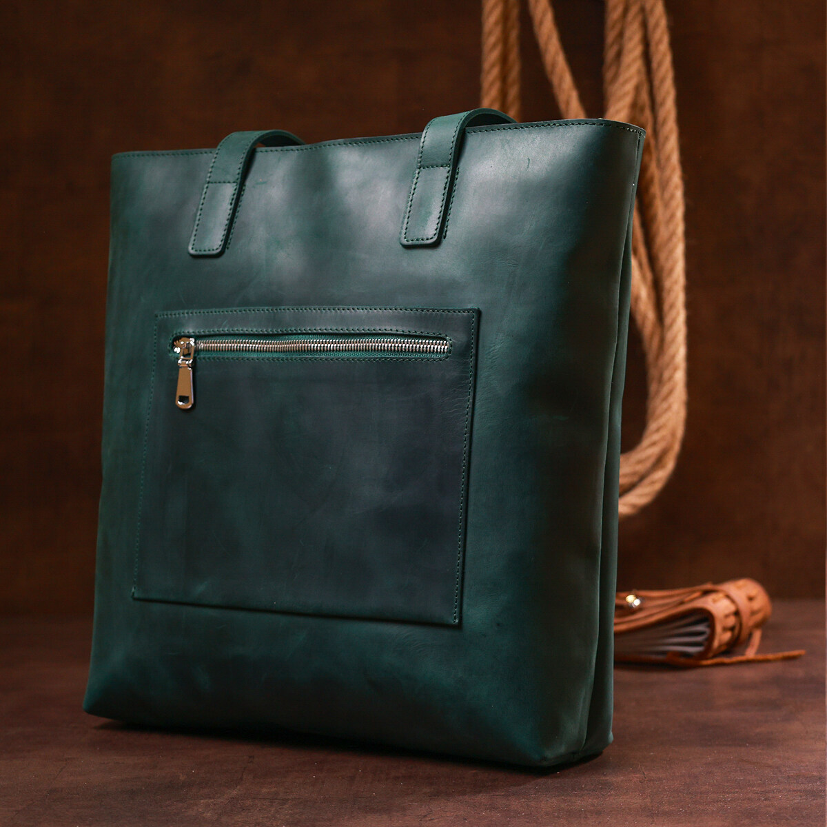 Замечательная вместительная женская сумка для шоппинга от украинского производителя в красивом и современном дизайне. Выполнена она из натуральной кожи высокого класса и отменной устойчивостью к износу. Цвет изделия – зеленый, фактура – гладкая и матовая, что смотрится очень стильно и модно. Основное отделение закрывается на молнию, оно довольно вместительное и удобное в использовании.
