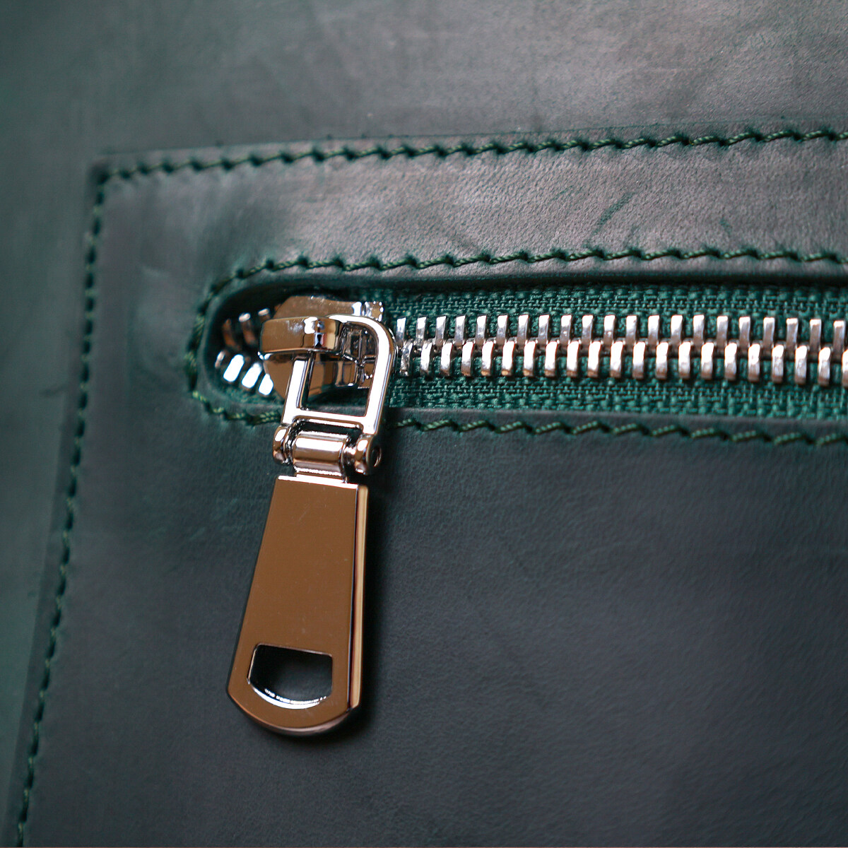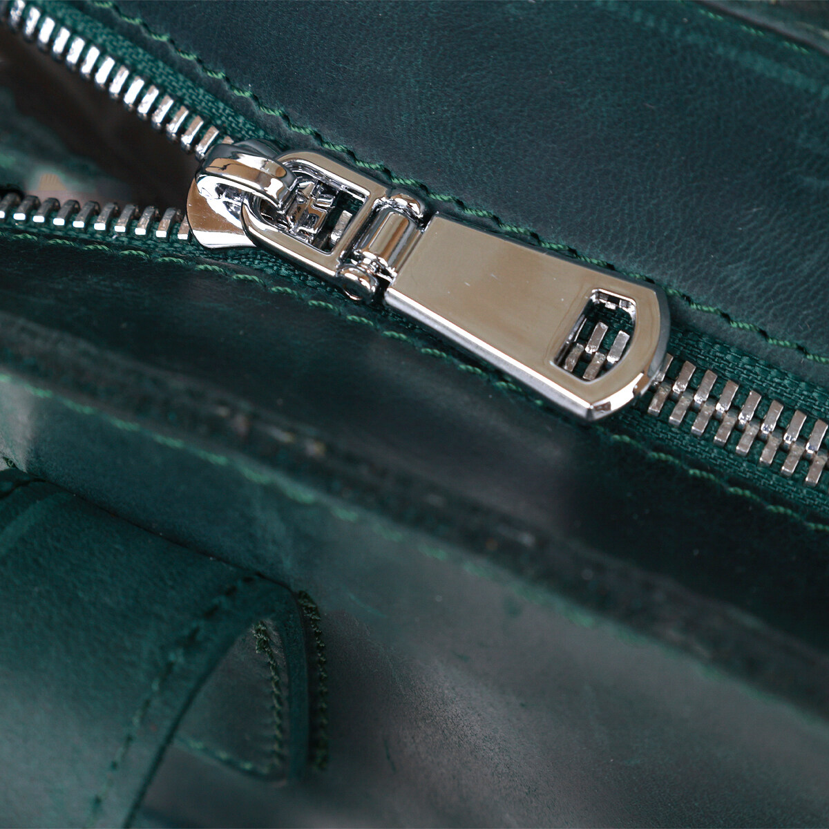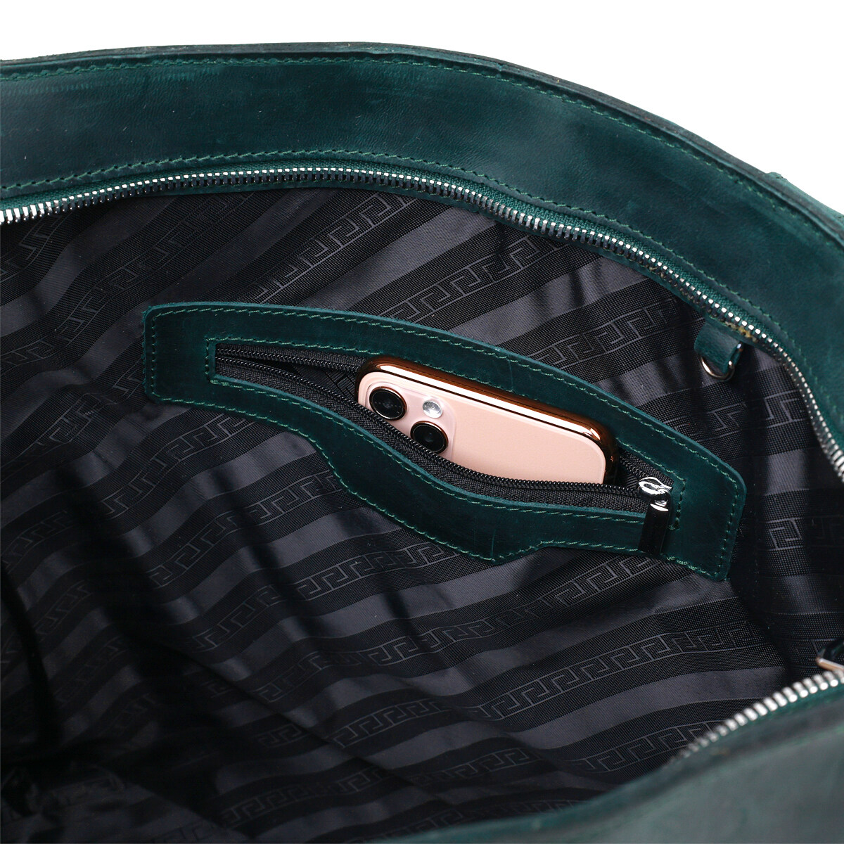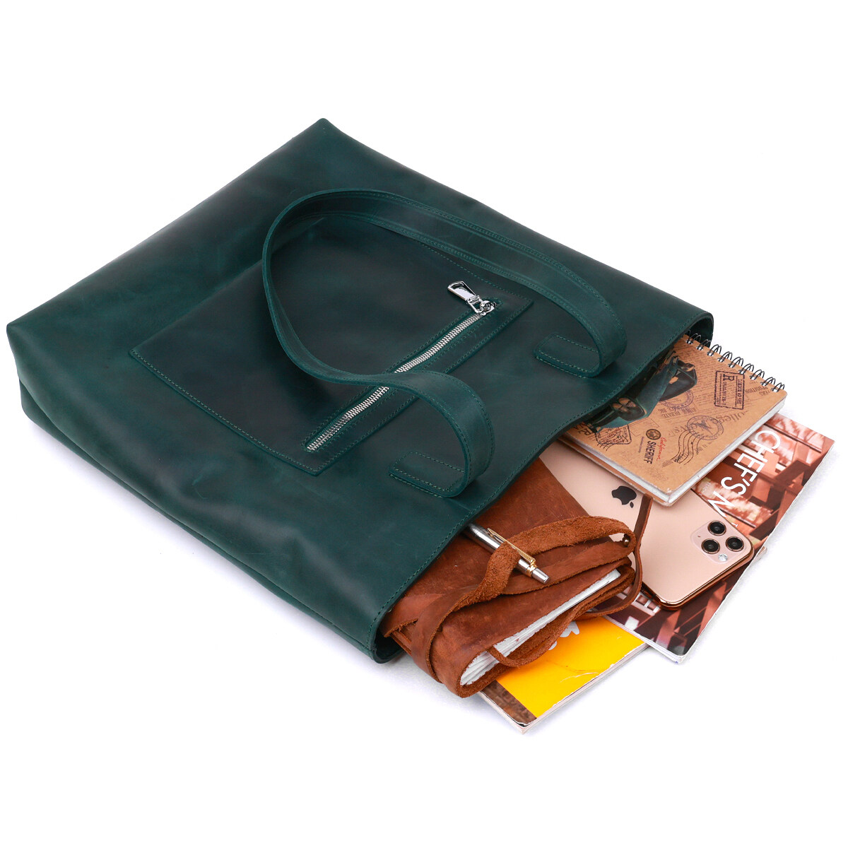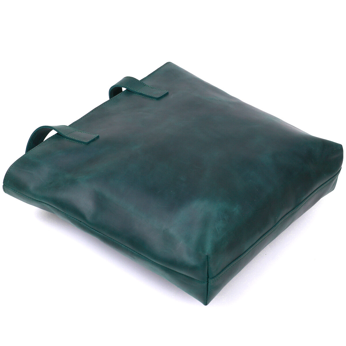 Замечательная вместительная женская сумка для шоппинга от украинского производителя в красивом и современном дизайне. Выполнена она из натуральной кожи высокого класса и отменной устойчивостью к износу. Цвет изделия – зеленый, фактура – гладкая и матовая, что смотрится очень стильно и модно. Основное отделение закрывается на молнию, оно довольно вместительное и удобное в использовании.