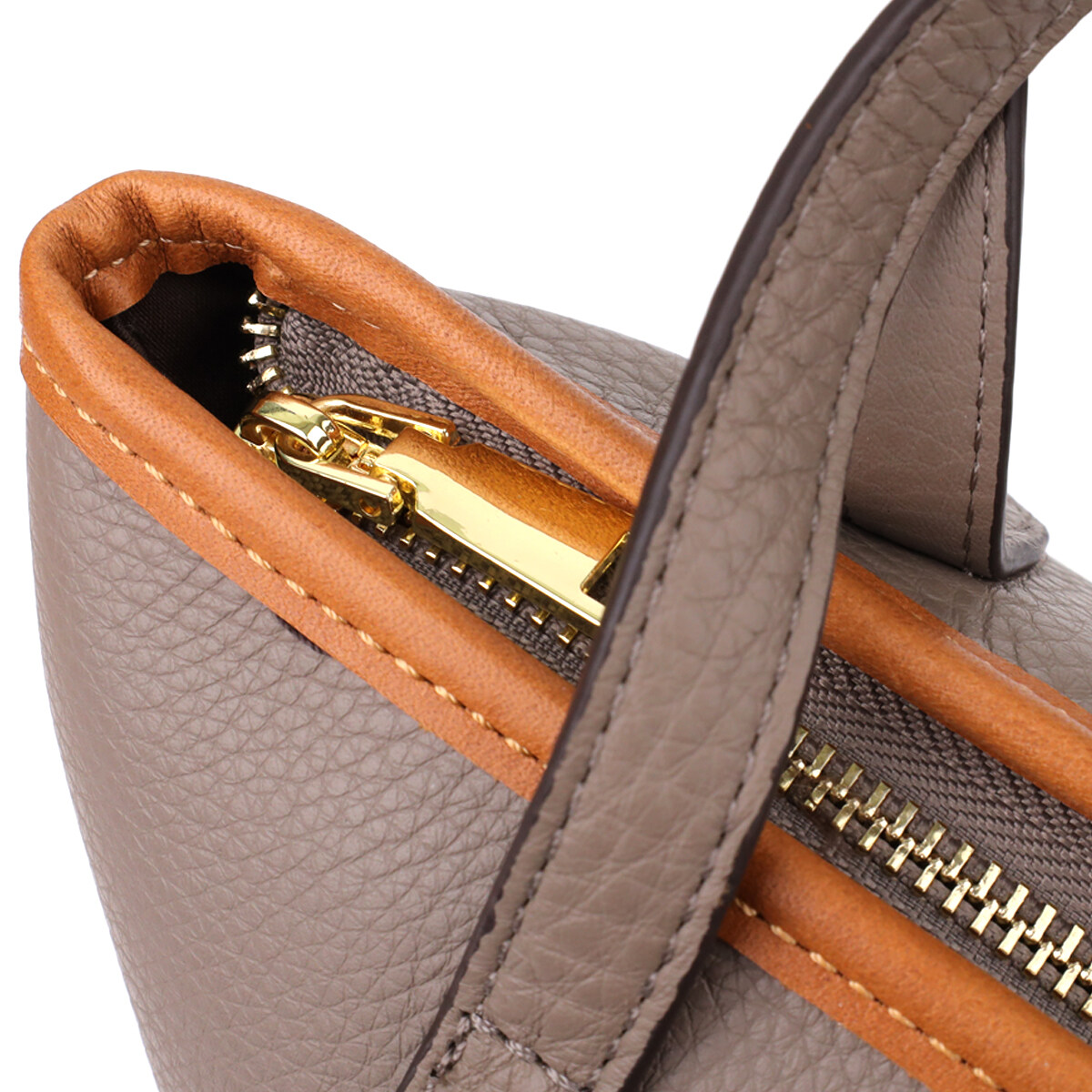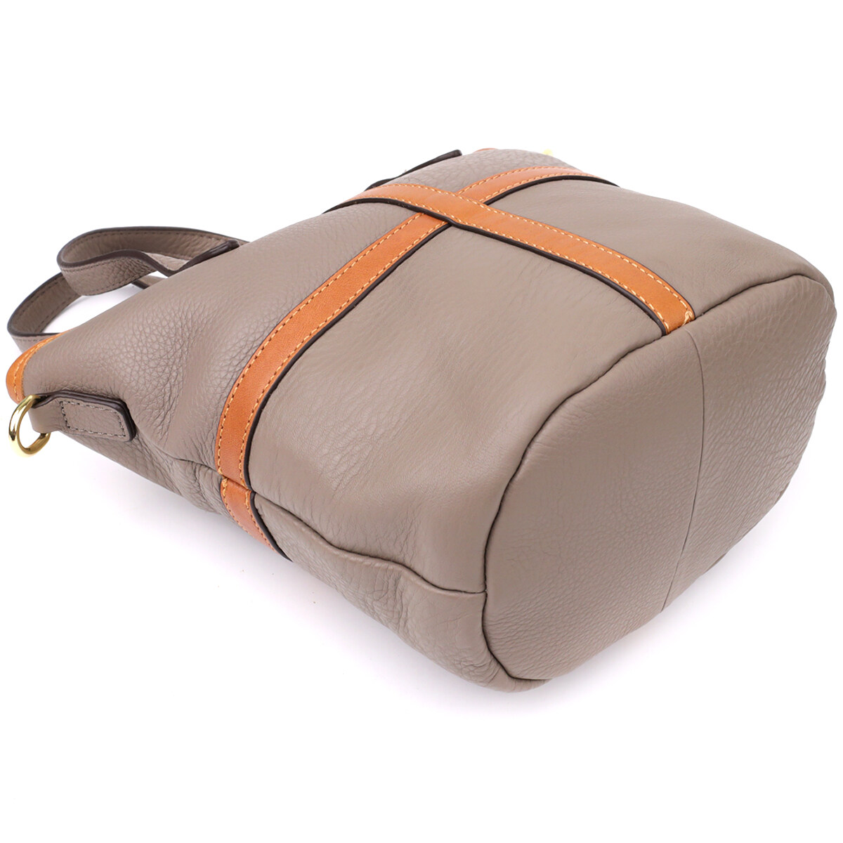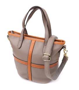Твёрдое дно помогает сумке сохранять форму и придаёт ей устойчивость. Фурнитура цвета жёлтого золота эффектно контрастирует с благородным серым оттенком кожи, добавляя аксессуару утончённости.