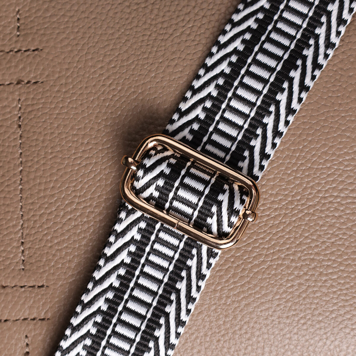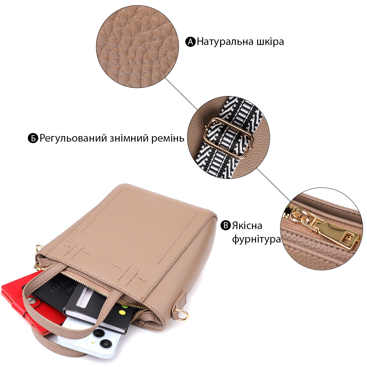 Фурнитура в изысканном золотом цвете гармонично сочетается с тёплым оттенком кожи, добавляя образу утончённости. Съемный текстильный ремешок позволяет носить сумку через плечо или на плече, обеспечивая максимальный комфорт в повседневной носке.