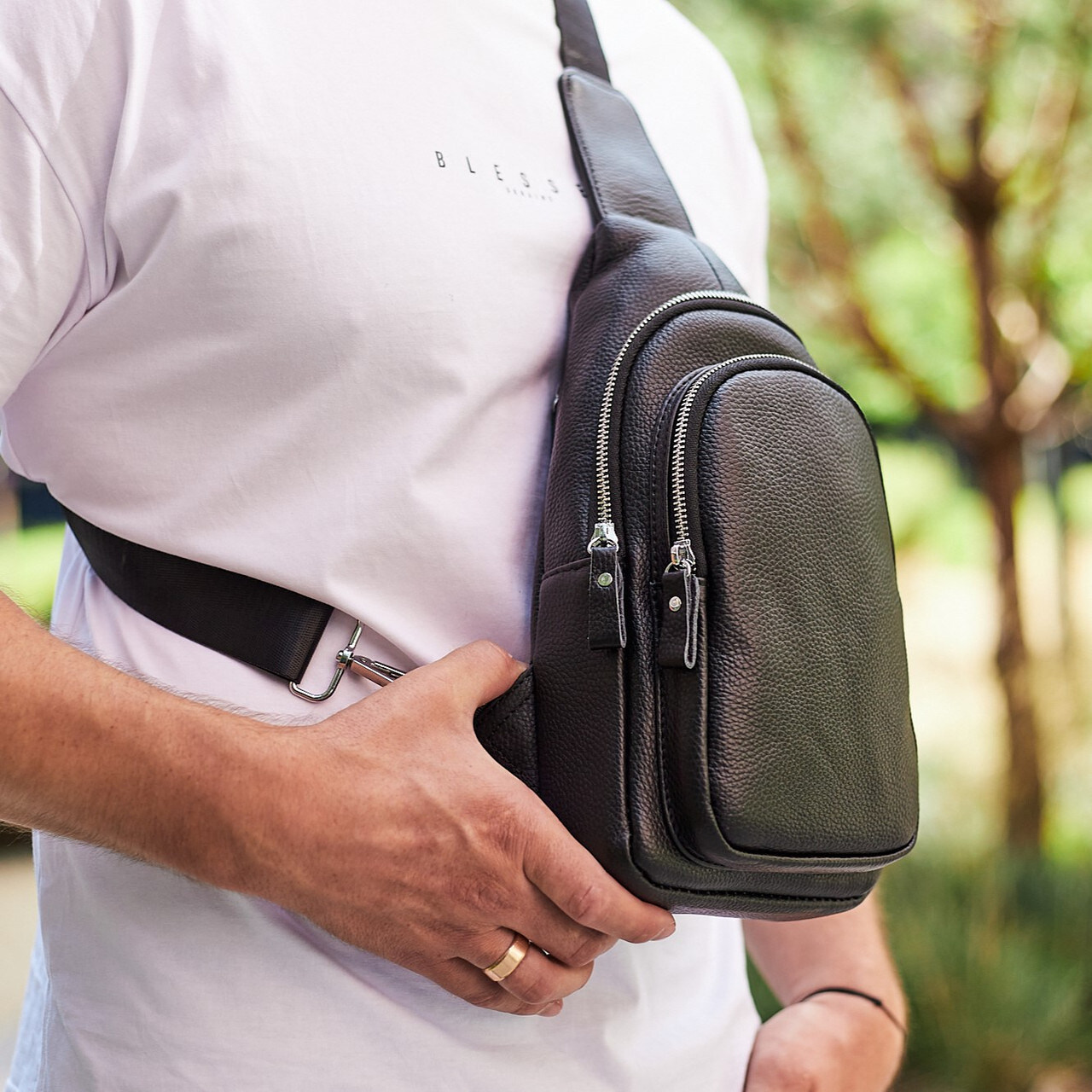 Молодёжная сумка-слинг через плечо. Сумка сделана из натуральной кожи с текстурой флотар. Благодаря такой модели, вы улучшите комфорт перемещения по городу. В ней вы сможете легко разместить ключи, телефон, кошелек и другие мелочи,