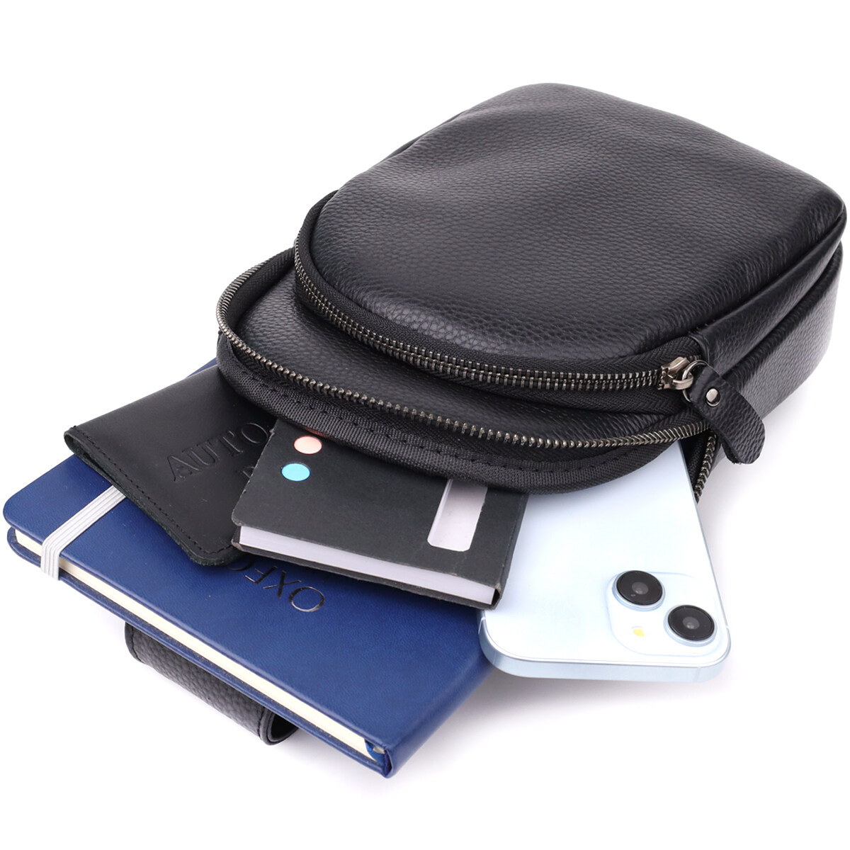 Кожаная сумка через плечо — практичный и стильный аксессуар на каждый день. Изготовлена из прочной зернистой кожи флотар, устойчива к износу и деформациям. Удобная организация внутреннего пространства: вместительное основное отделение на молнии, потайной карман и дополнительные отделения для мелочей. На лицевой стороне — накладной и встроенный горизонтальный карманы на молнии, на тыльной — еще один карман для быстрого доступа. Регулируемый текстильный ремень позволяет комфортно носить сумку через плечо, освобождая руки. Отличный выбор для тех, кто ценит качество и удобство в повседневных аксессуарах.