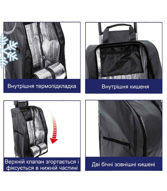 - Верхняя текстильная ручка позволит переносить и использовать сумку отдельно от тележки.
