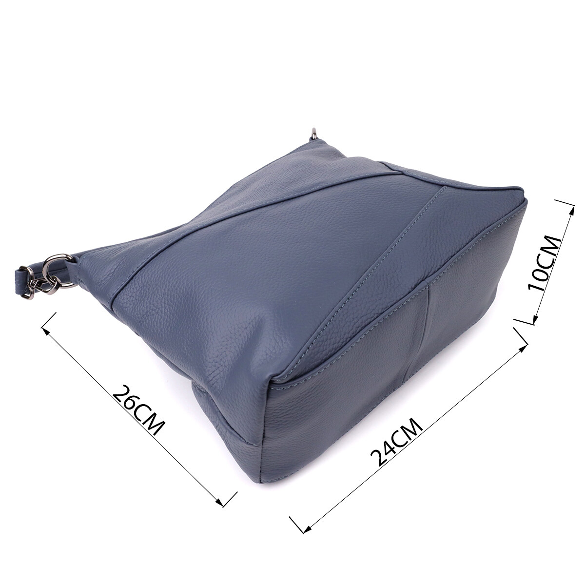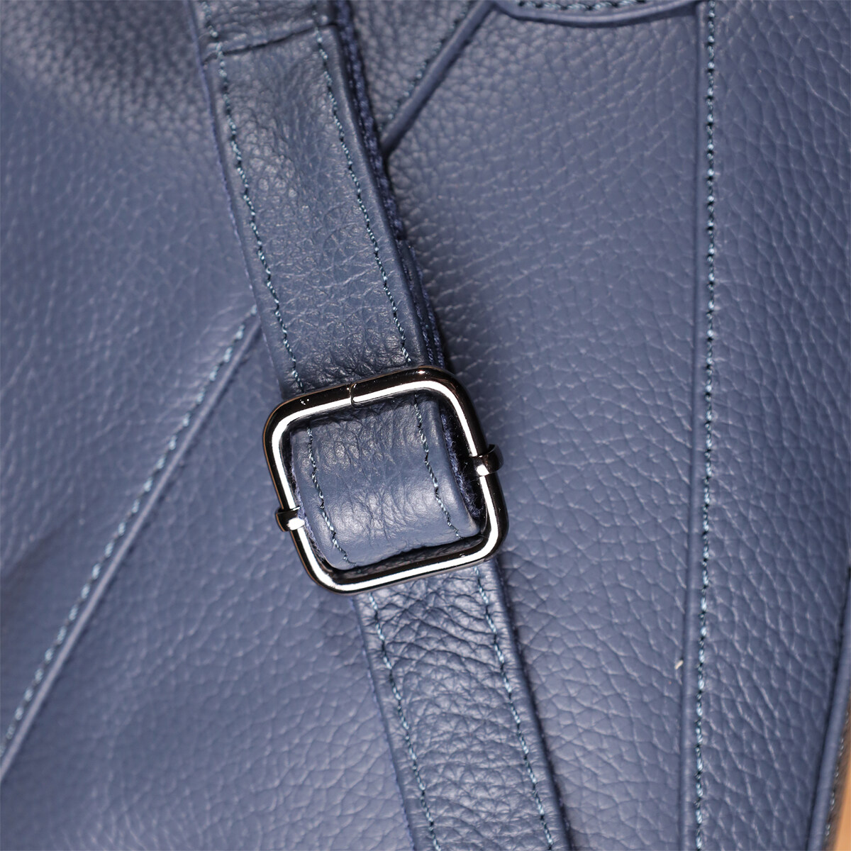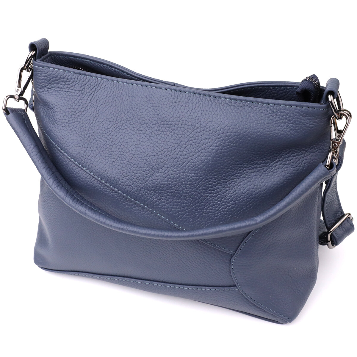 Фурнитура под серебро гармонично сочетается с насыщенным синим цветом кожи, подчеркивая стильный характер сумки. Два съемных кожаных ремешка дают возможность носить её на плече, через плечо или в руках, легко подстраиваясь под ваш ритм жизни и предпочтения.