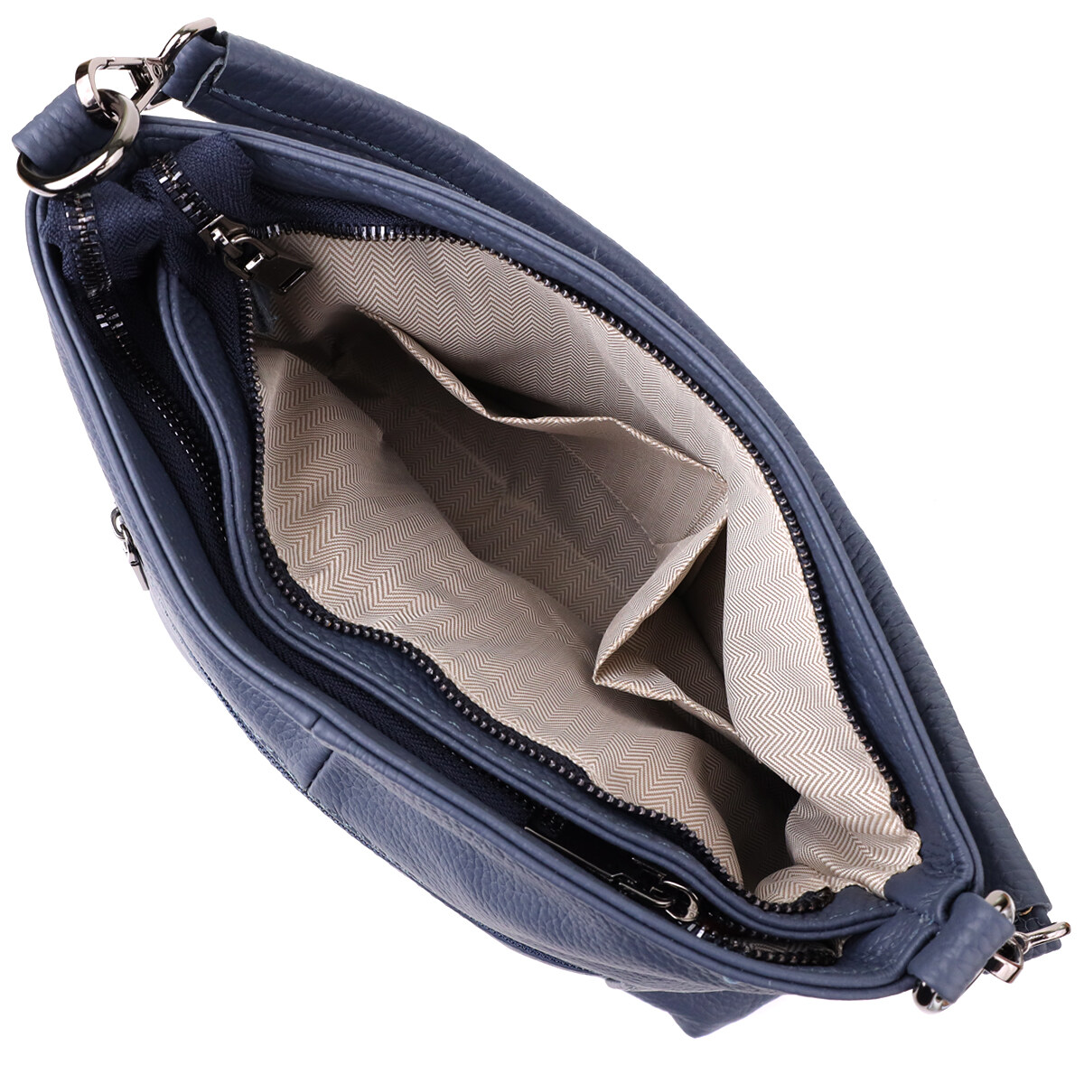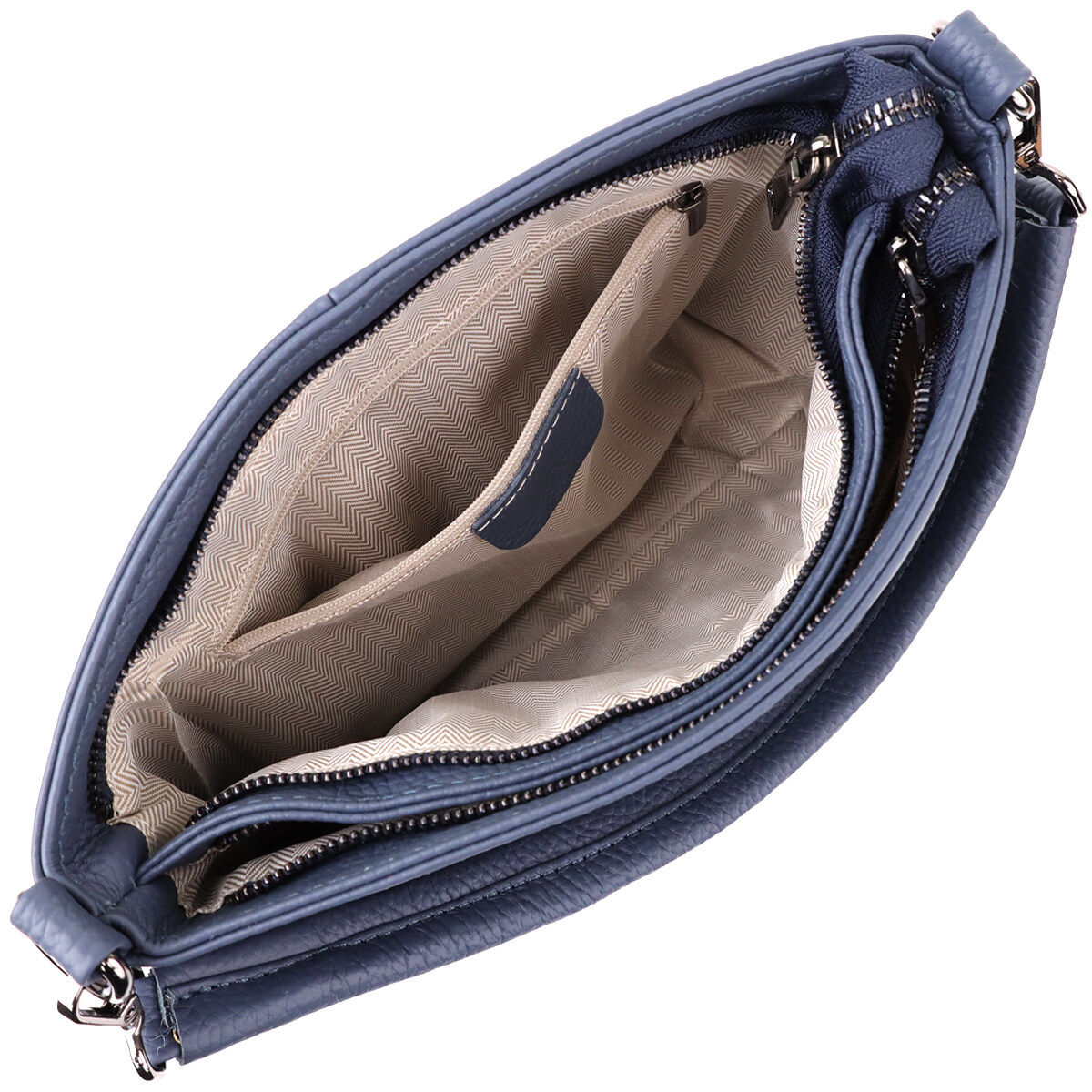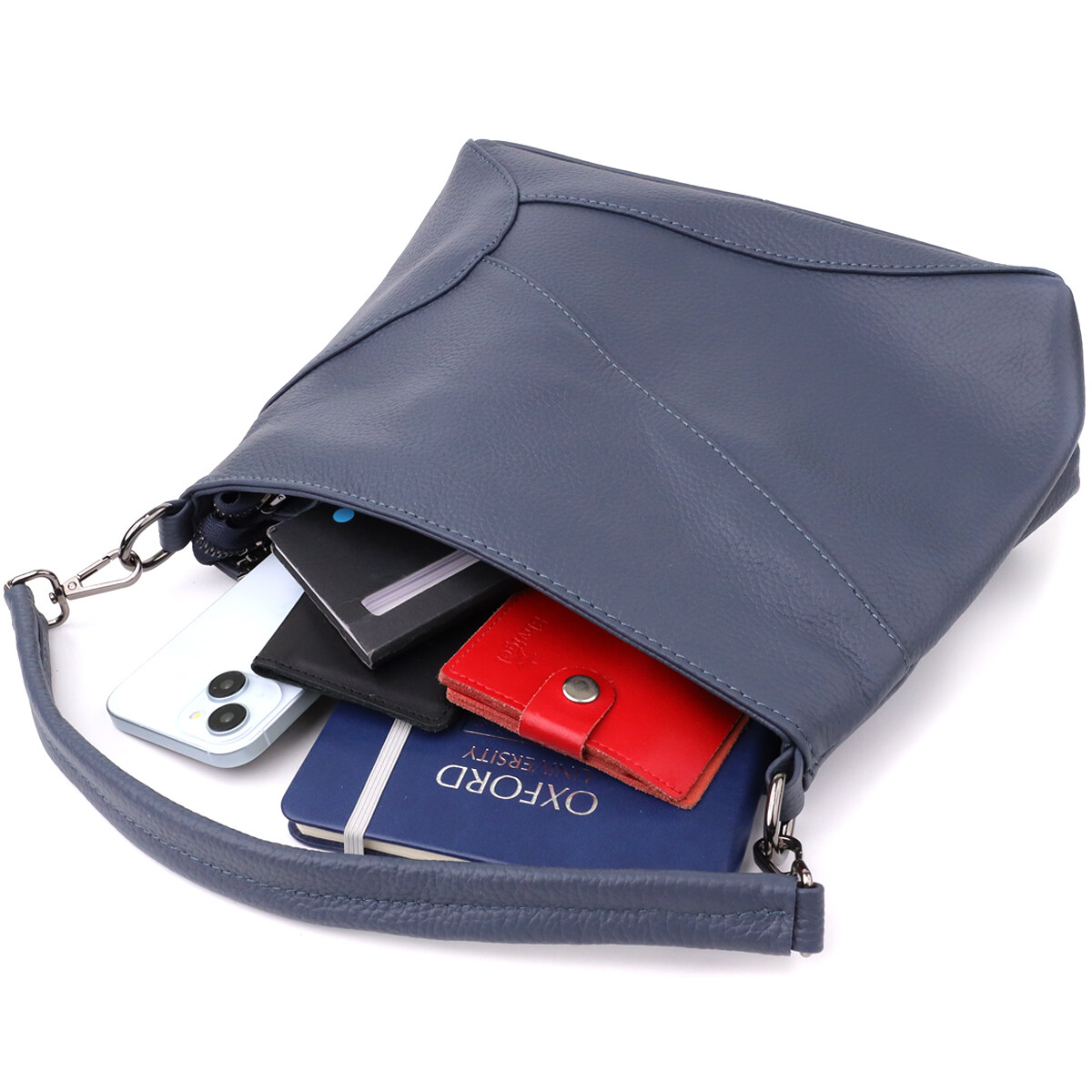 Фурнитура под серебро гармонично сочетается с насыщенным синим цветом кожи, подчеркивая стильный характер сумки. Два съемных кожаных ремешка дают возможность носить её на плече, через плечо или в руках, легко подстраиваясь под ваш ритм жизни и предпочтения.