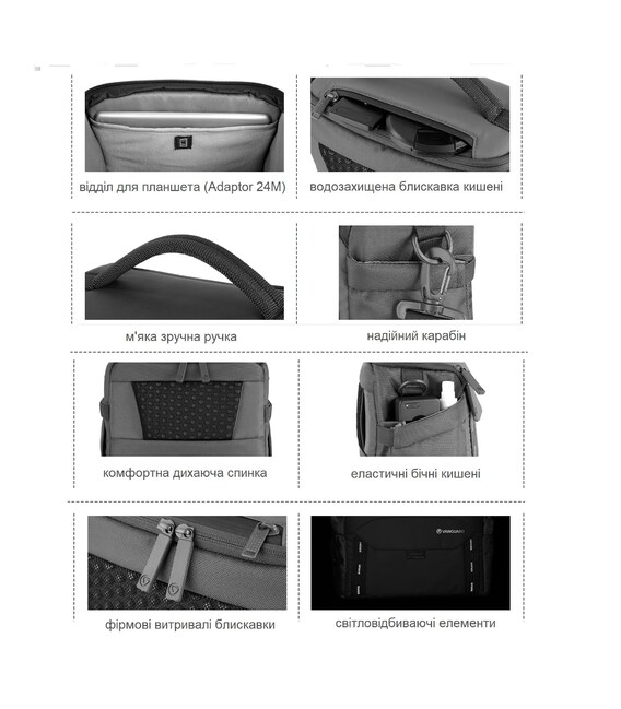 - Светоотражающие элементы на фасаде сумки помогут оставаться пользователю видимым в вечернее время суток и быть в безопасности при передвижении вдоль проезжей части.