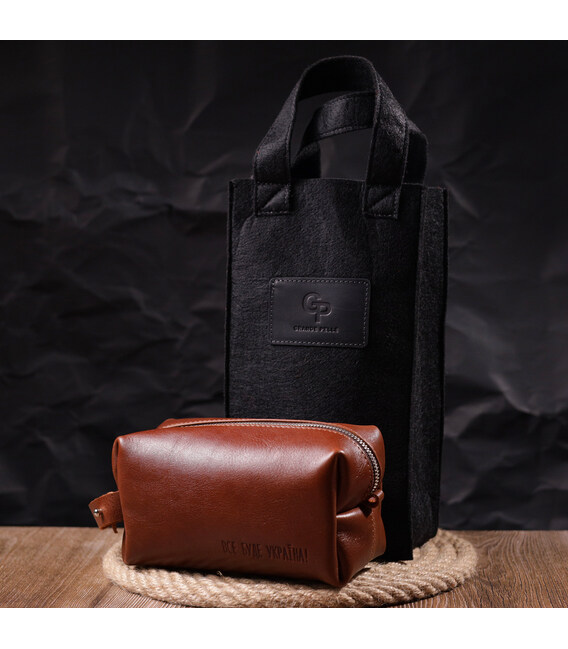 Вместительный мужской несессер, среднего размера в красивой гладкой коже, с патриотическим тиснением на лицевой стороне “Все буде Україна”. Имеет просторное отделение, в которое поместятся все необходимые Вам вещи. Надежная фурнитура представлена в серебряном цвете. Для удобной переноски аксессуара есть специальная ручка на боковой стенке. Упакована данная косметичка в красивую фетровую сумочку. Изделия из кожи – отличная идея подарка на любые праздники.